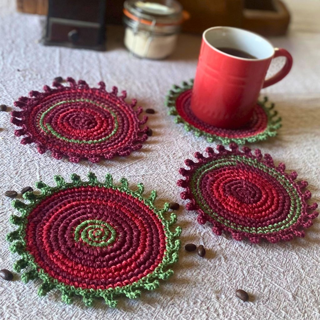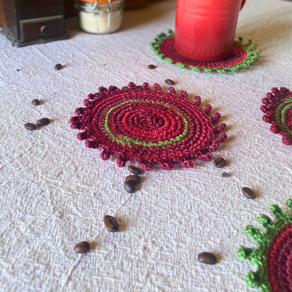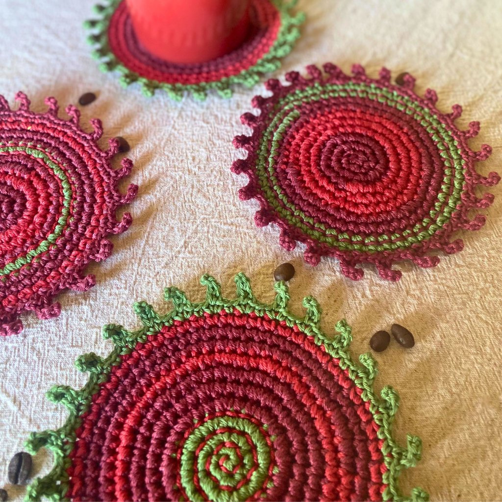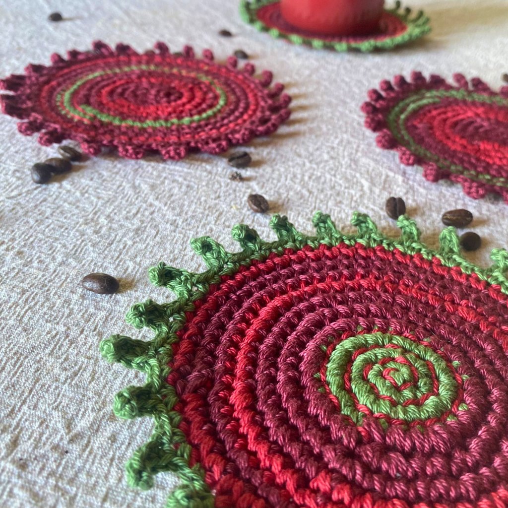 Ručně háčkované a vyšívané podšálky z přírodní bavlněné příze v barvách podzimu – vínová, tmavě červená a zelená. Každý kus je originál – praktická radost, která vydrží.