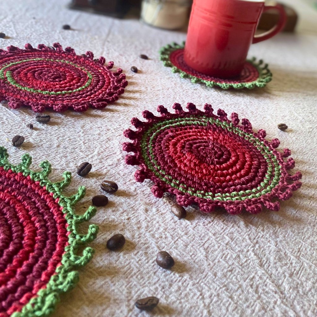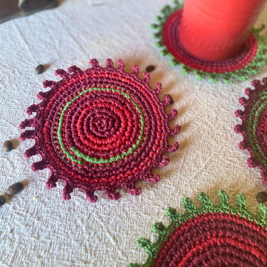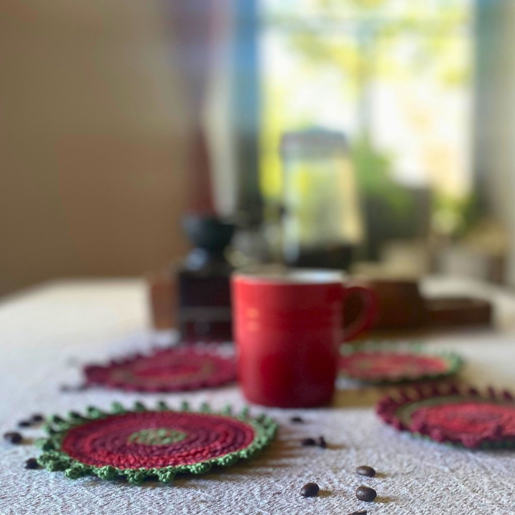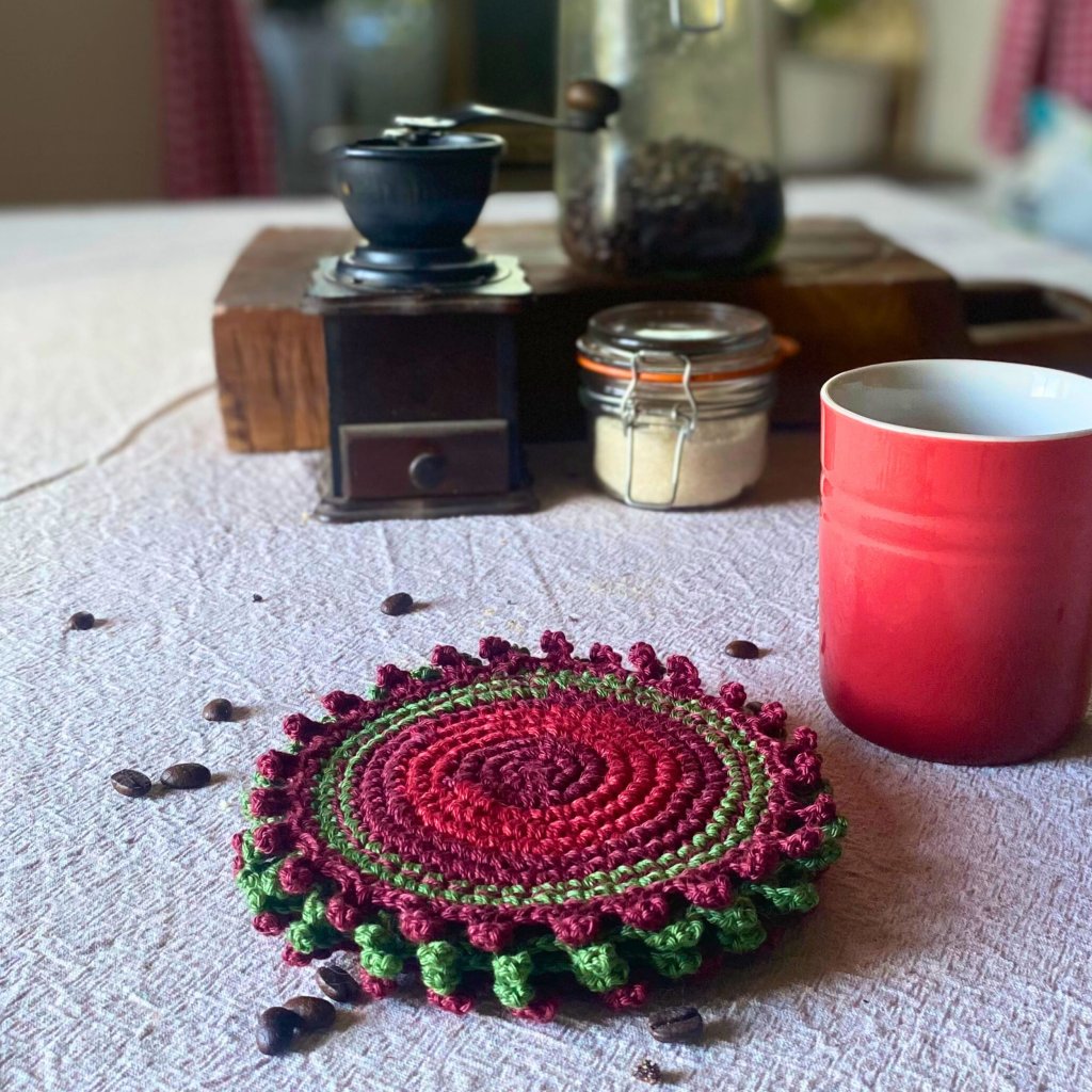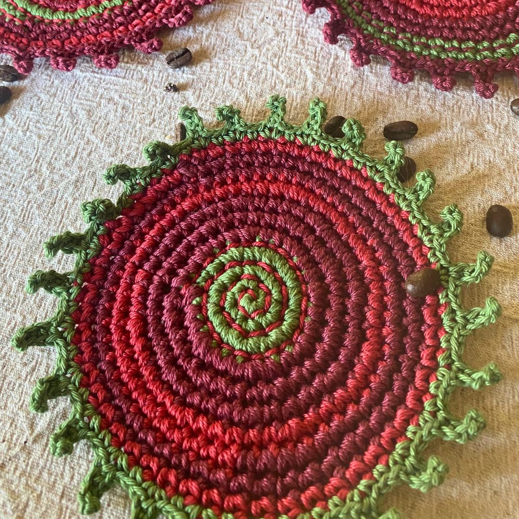 Ručně háčkované a vyšívané podšálky z přírodní bavlněné příze v barvách podzimu – vínová, tmavě červená a zelená. Každý kus je originál – praktická radost, která vydrží.