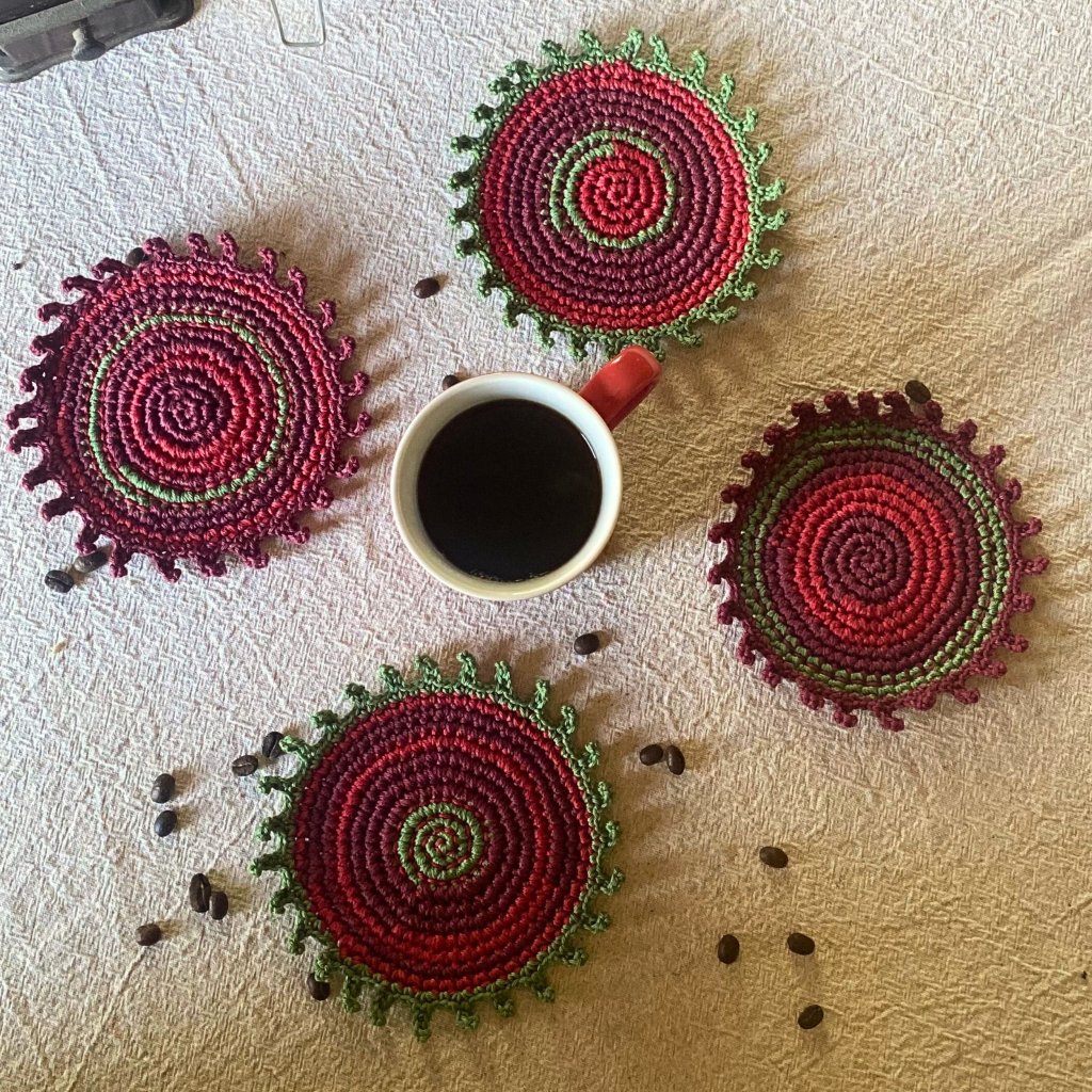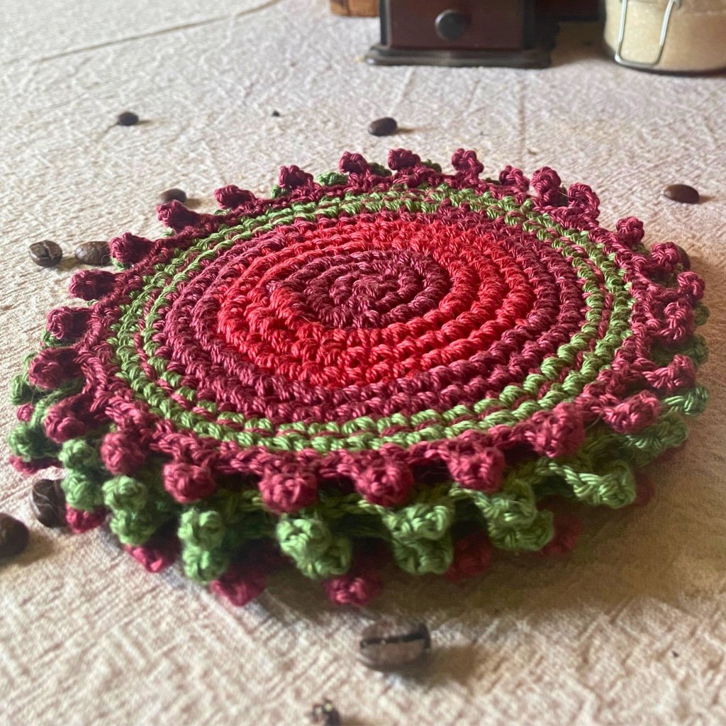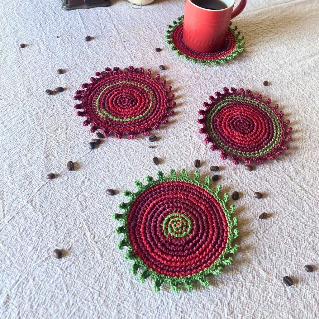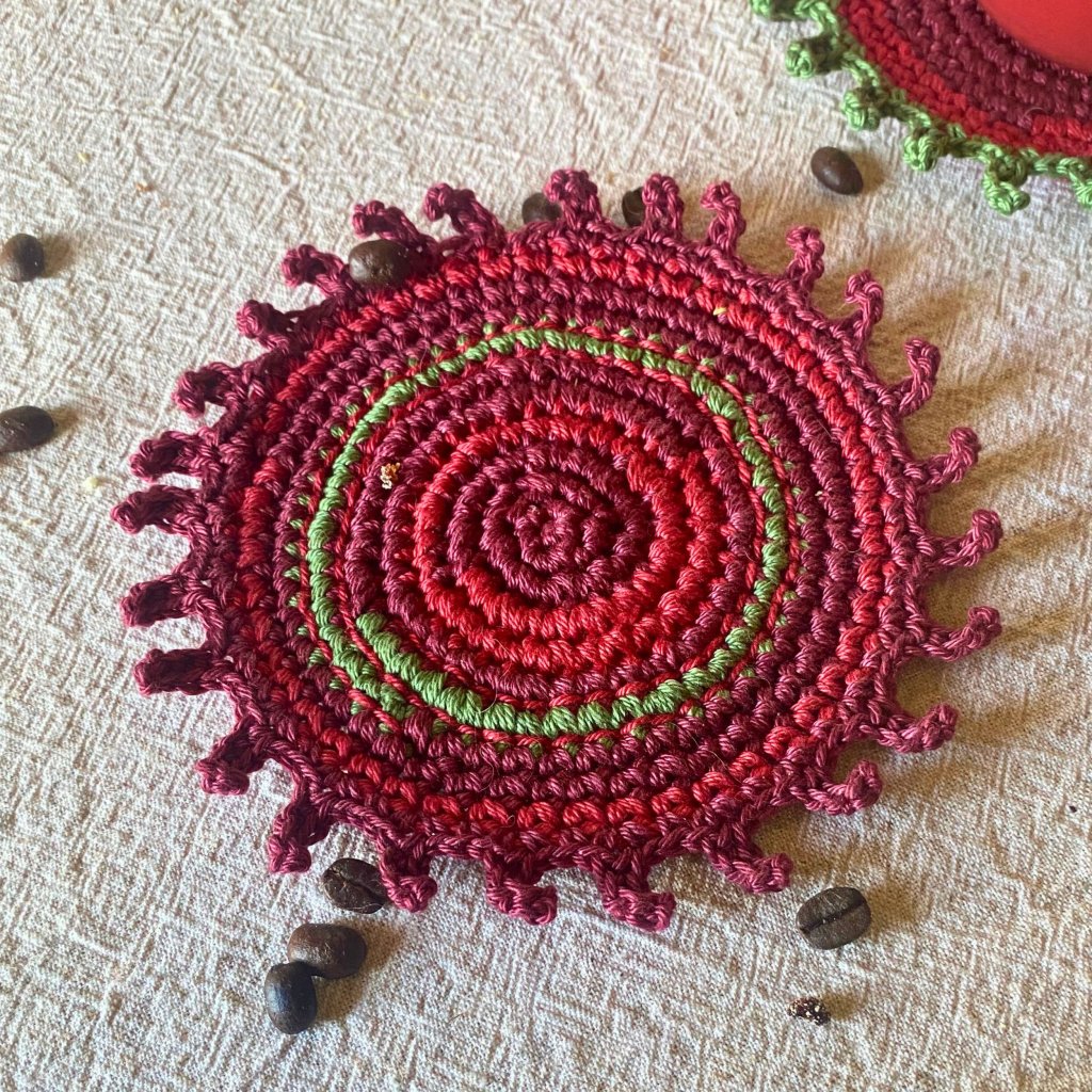 Ručně háčkované a vyšívané podšálky z přírodní bavlněné příze v barvách podzimu – vínová, tmavě červená a zelená. Každý kus je originál – praktická radost, která vydrží.