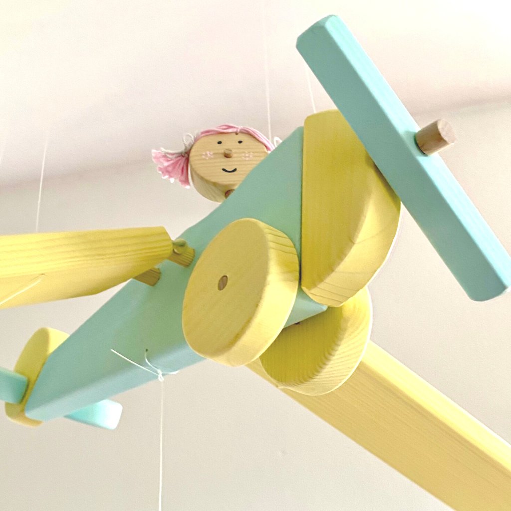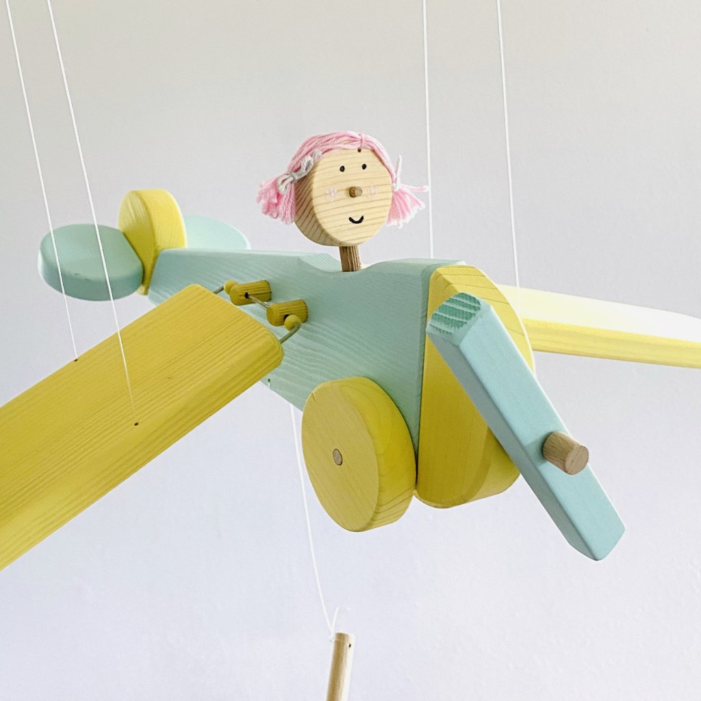 Jedná se o unikátní kinetický mobil, který visí na stejně dlouhých vlascích a docela jednoduše se pověsí na háček třeba do dětského pokoje. Nebo kamkoliv :). Pak stačí zatáhnout za dřevěný váleček, který má připevněný na trupu letadla. A je to. Letadlo mává křídly a letí!