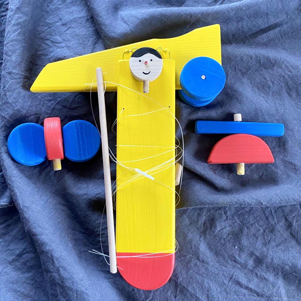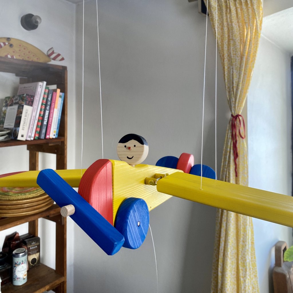 Dřevěné a taky veselé létající letadlo, které opravdu létá. V barvách sytě žluté, červené a modré. Pilotem letadýlka je černovlasý kluk, ale můžete mít i pilotku. Tenhle eroplán bude jistě hezkým doplňkem v každém, nejen klučičím pokoji.