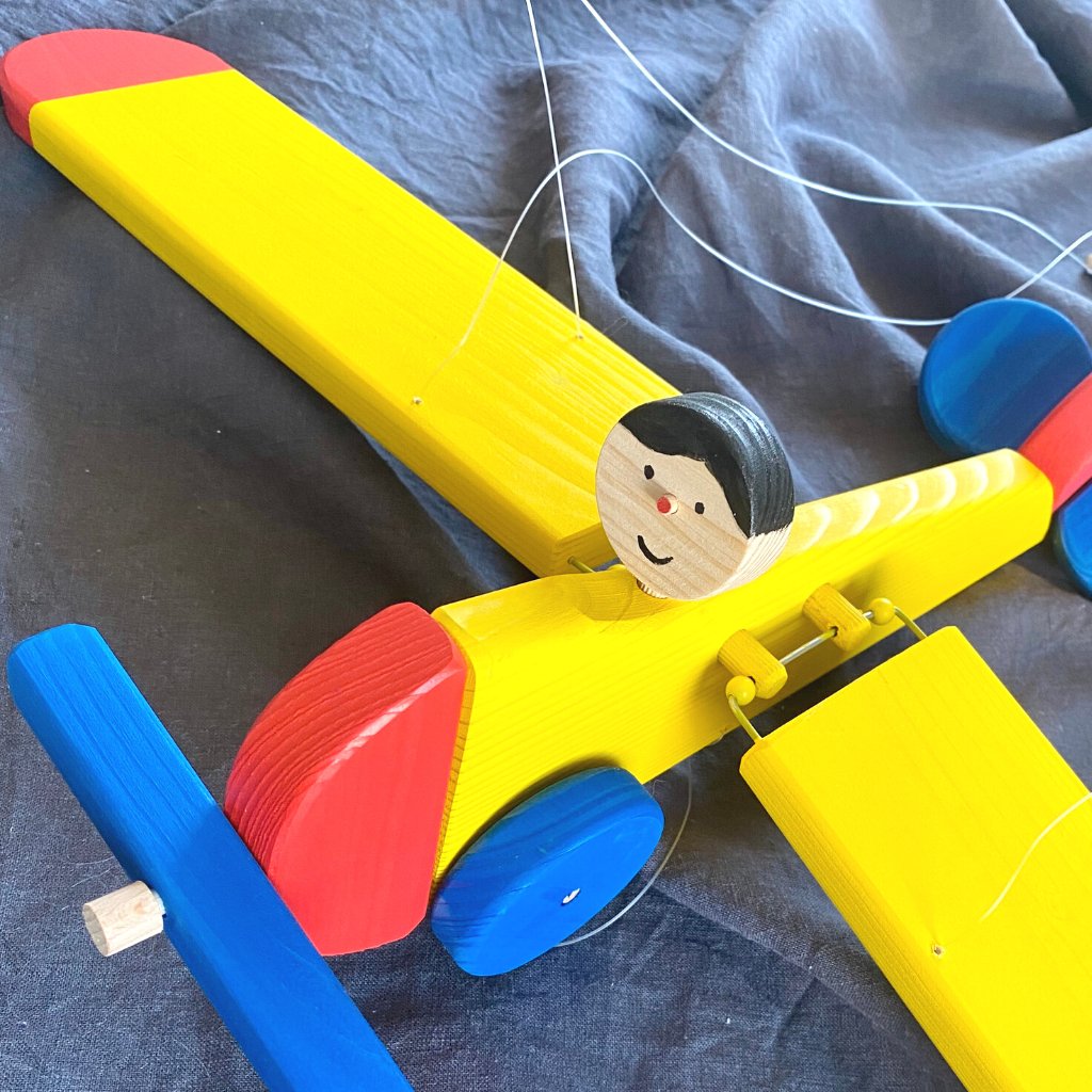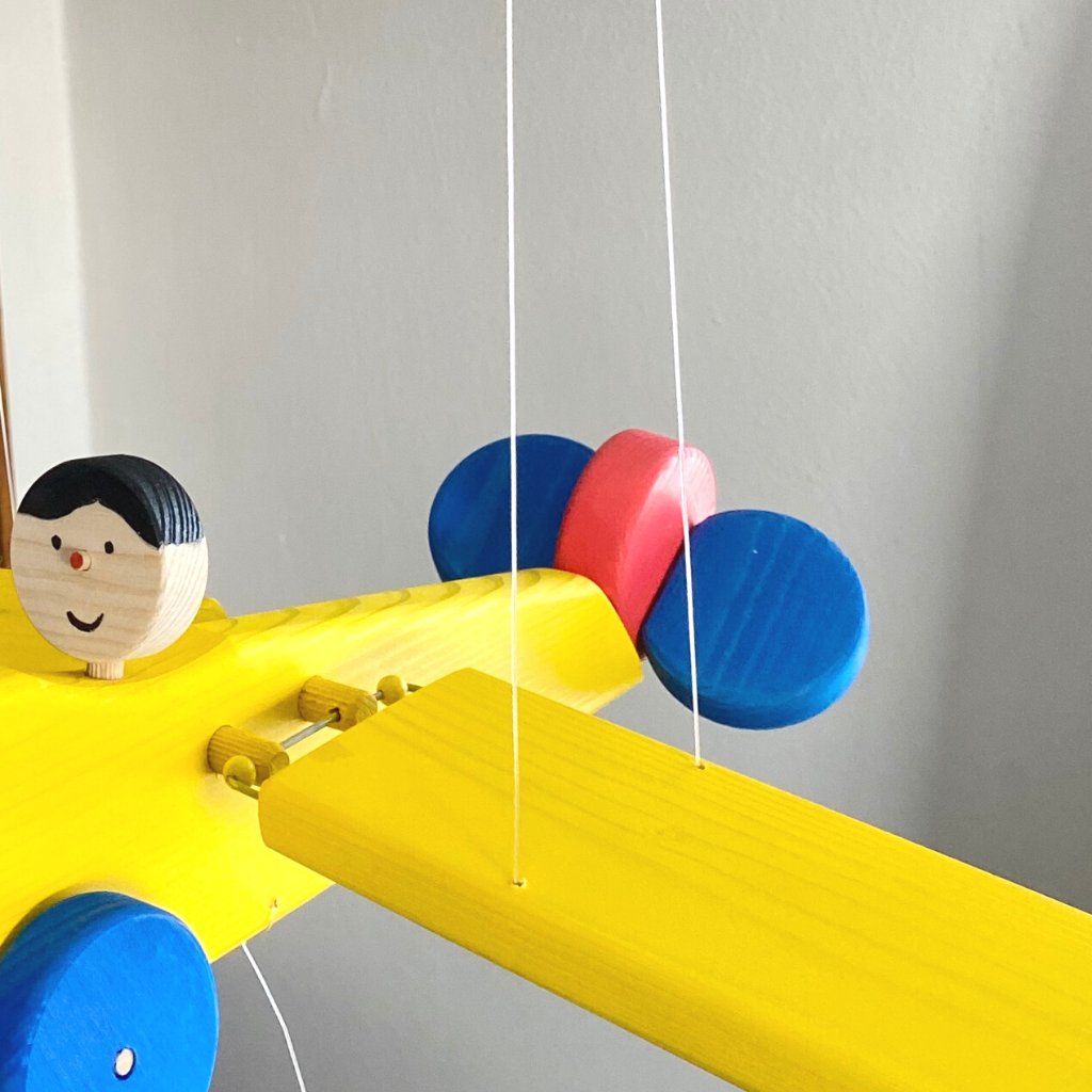 Jedná se o unikátní kinetický mobil, který visí na stejně dlouhých vlascích a docela jednoduše se pověsí na háček třeba do dětského pokoje. Nebo kamkoliv :). Pak stačí zatáhnout za dřevěný váleček, který má připevněný na trupu letadla. A je to. Letadlo mává křídly a letí!