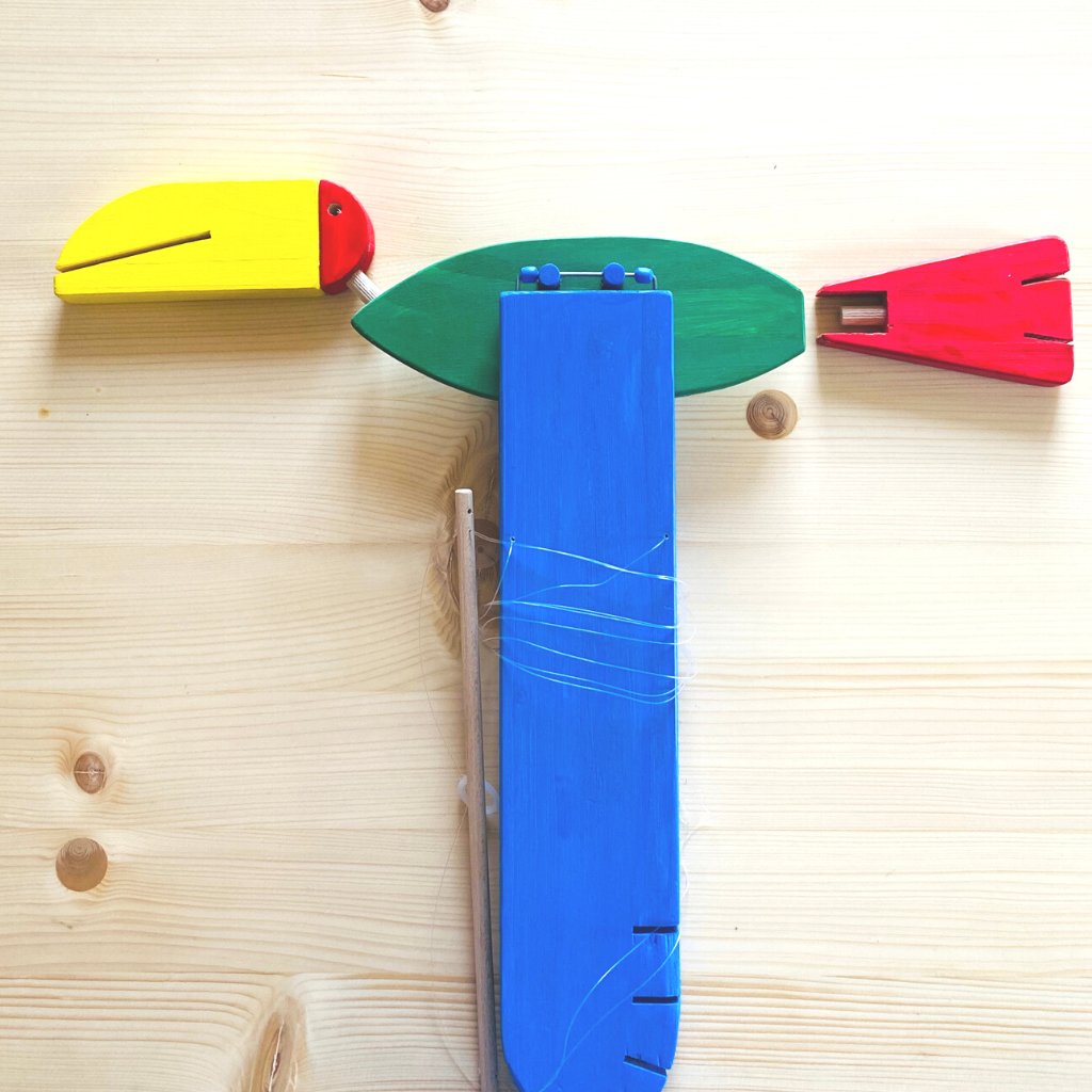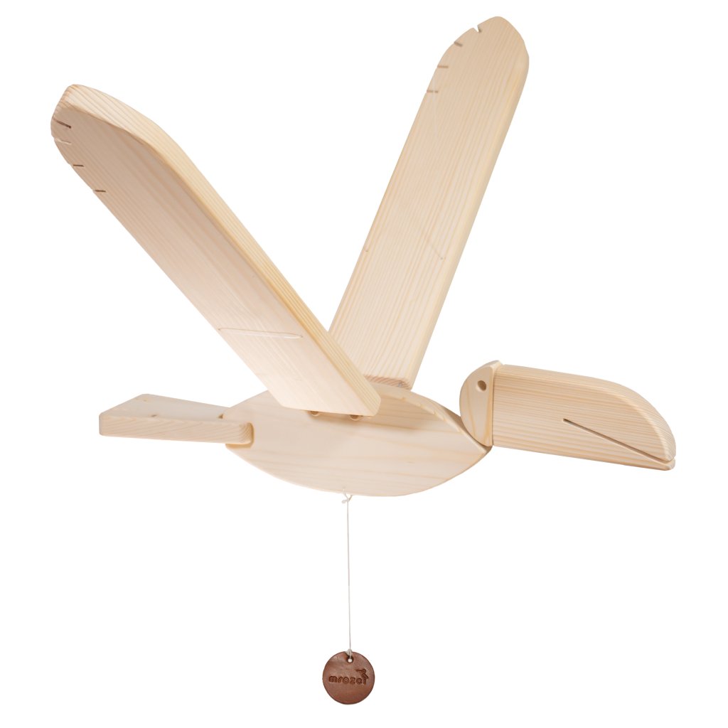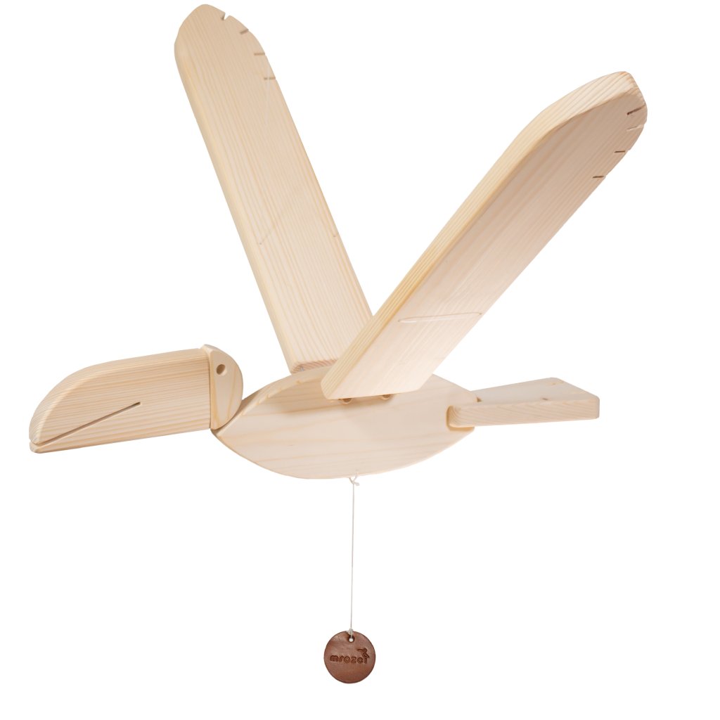 Jedná se o unikátní kinetický mobil, který visí na stejně dlouhých vlascích a docela jednoduše se pověsí na háček třeba do dětského pokoje. Nebo kamkoliv jinam :). Pak stačí zatáhnout za úchytku, kterou má připevněnou na bříšku a je to. Tukan mává křídly a letí!