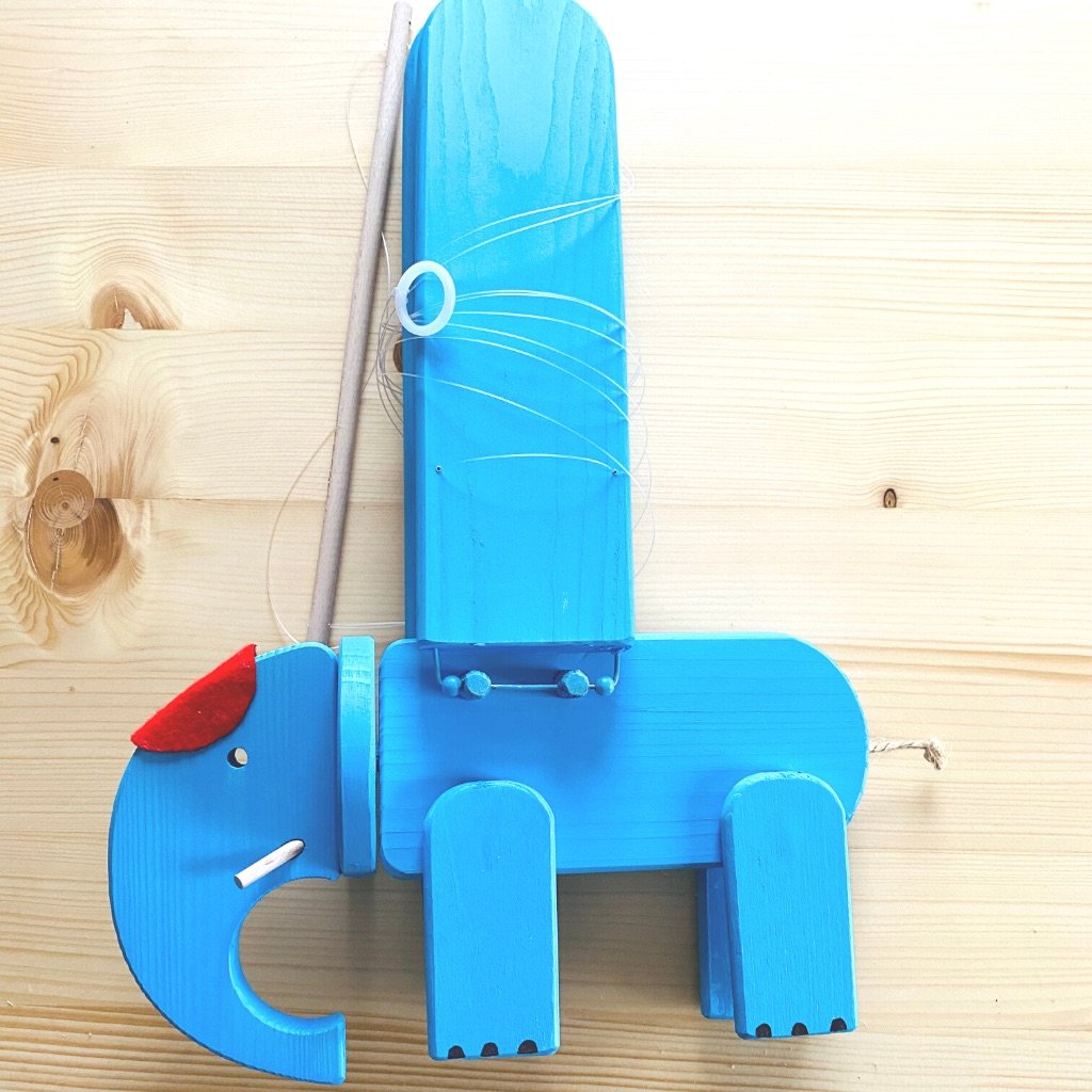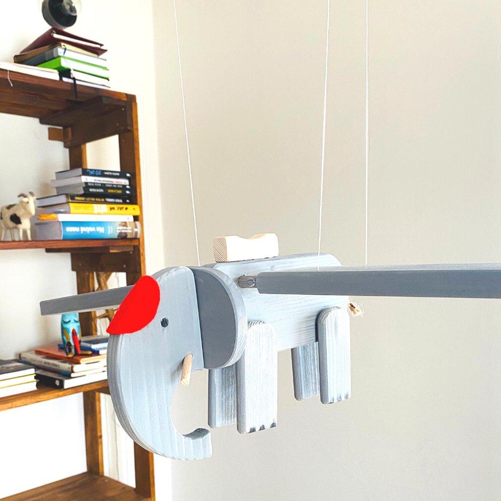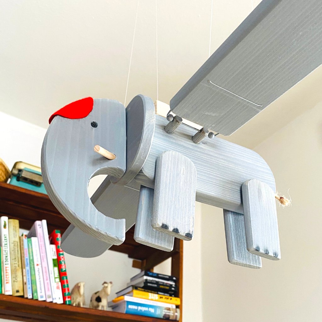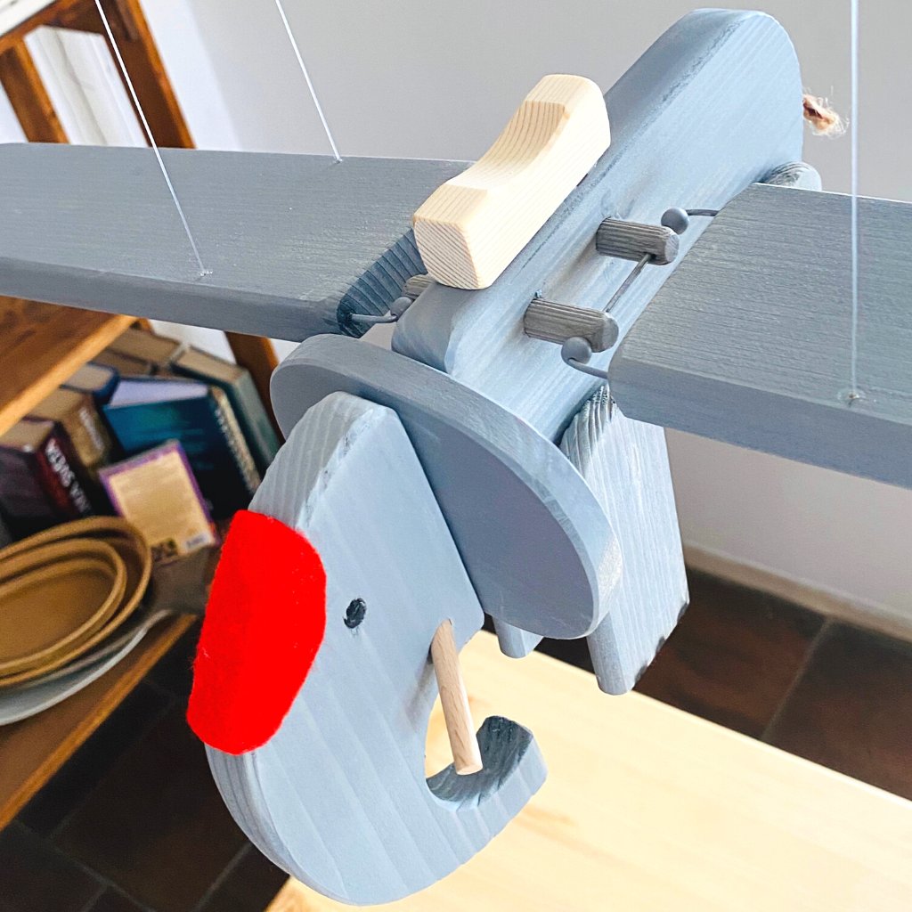 Jedná se o unikátní kinetický mobil, který visí na stejně dlouhých vlascích a docela jednoduše se pověsí na háček třeba do dětského pokoje. Nebo kamkoliv jinam :). Pak stačí zatáhnout za úchytku, kterou má připevněnou na bříšku a je to. Slon mává křídly a letí!