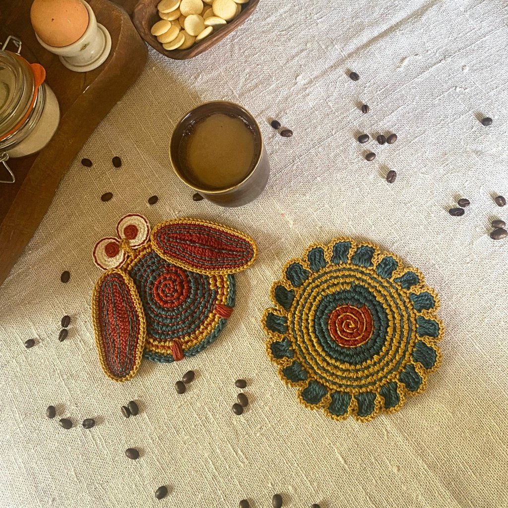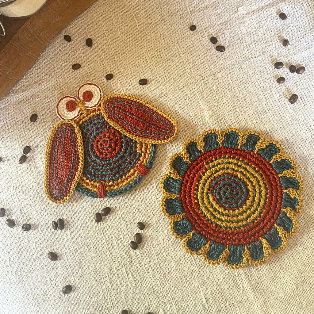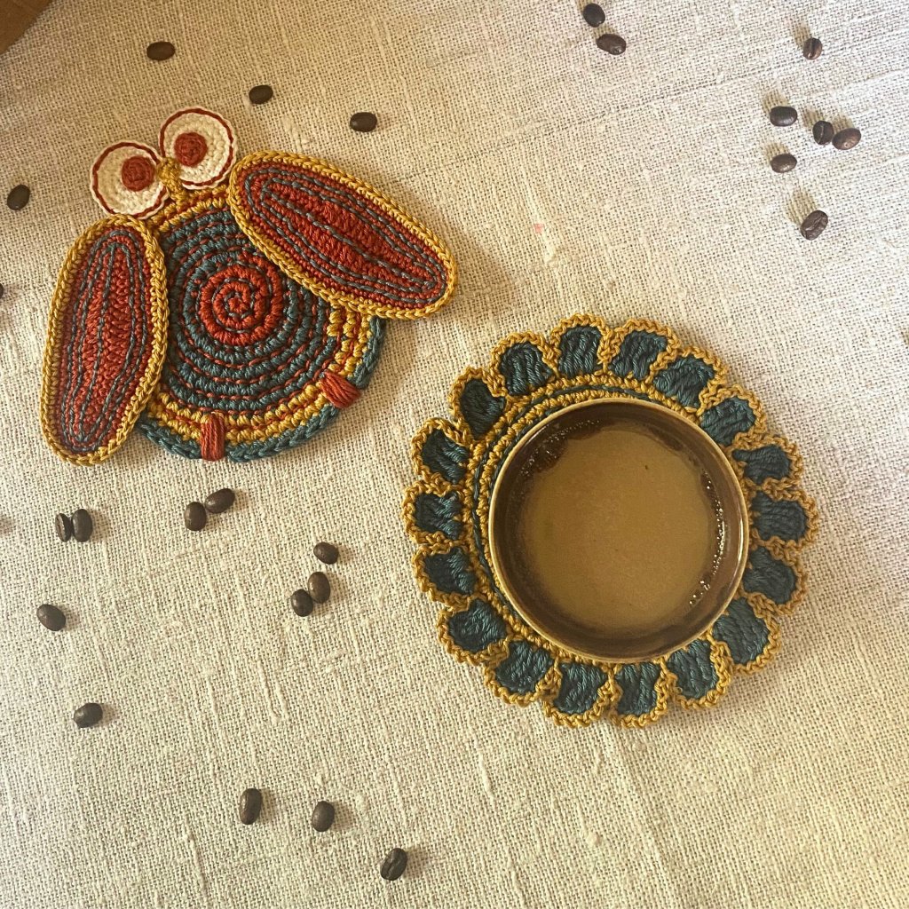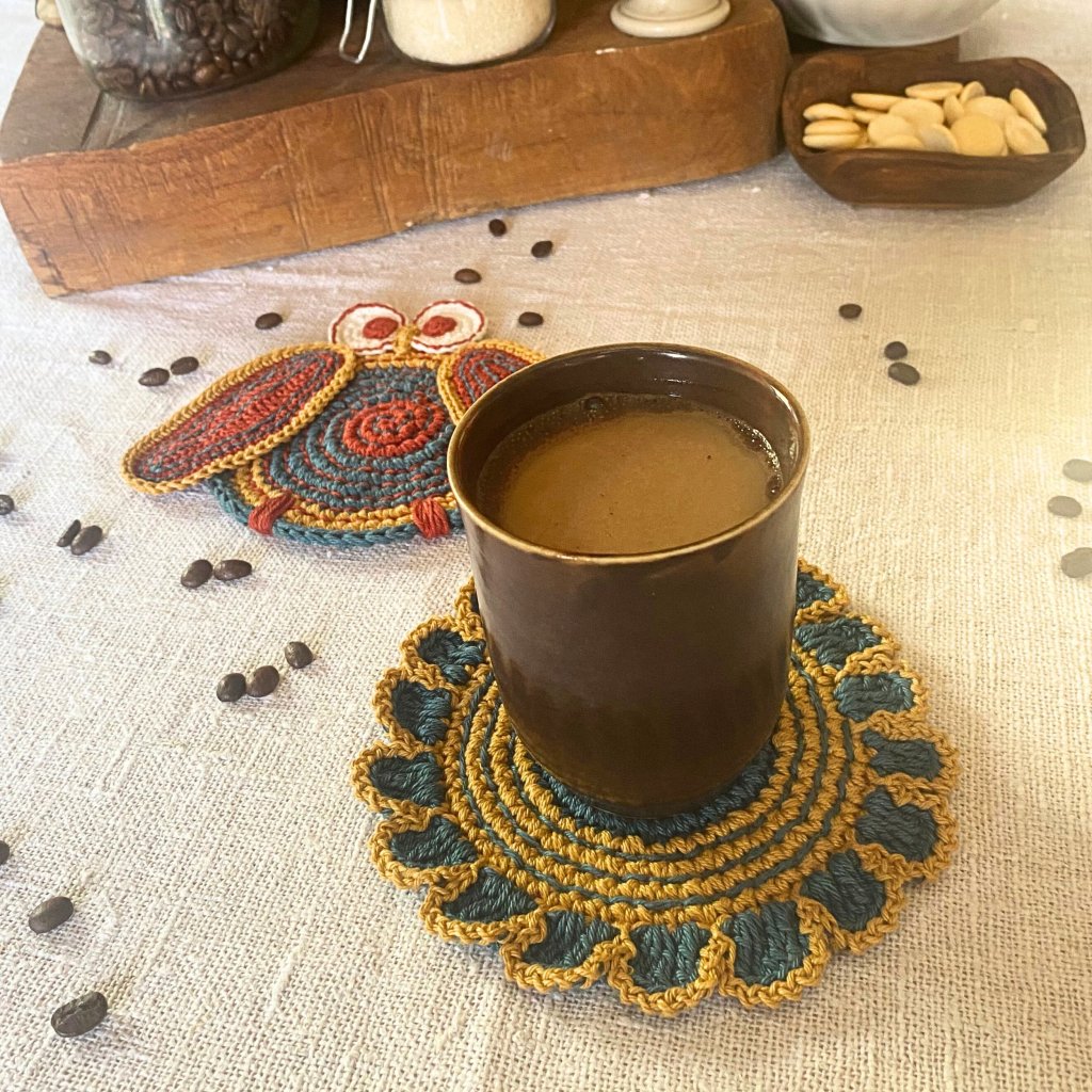 Sada dvou háčkovaných a vyšívaných podložek - sovička a květinka. S touhle sadou bude káždé ráno krásnější a káva nebo čaj bude chutnat o dost líp :).