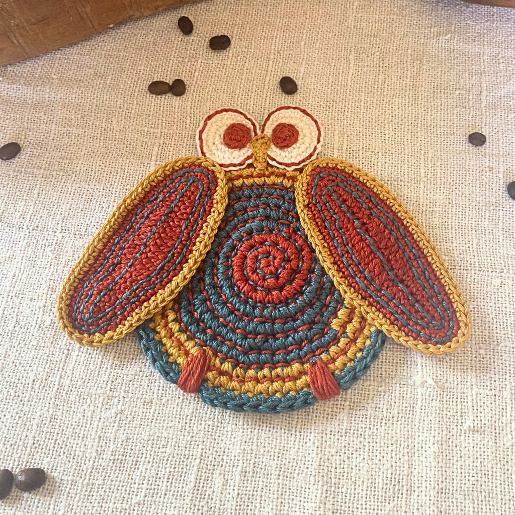Sada ručně háčkovaných a vyšívaných podšálků z přírodní příze ve tvaru sovičky a květinky. Každý kus je originál –můžu vyrobit podobný, ale nikdy ne stejný.