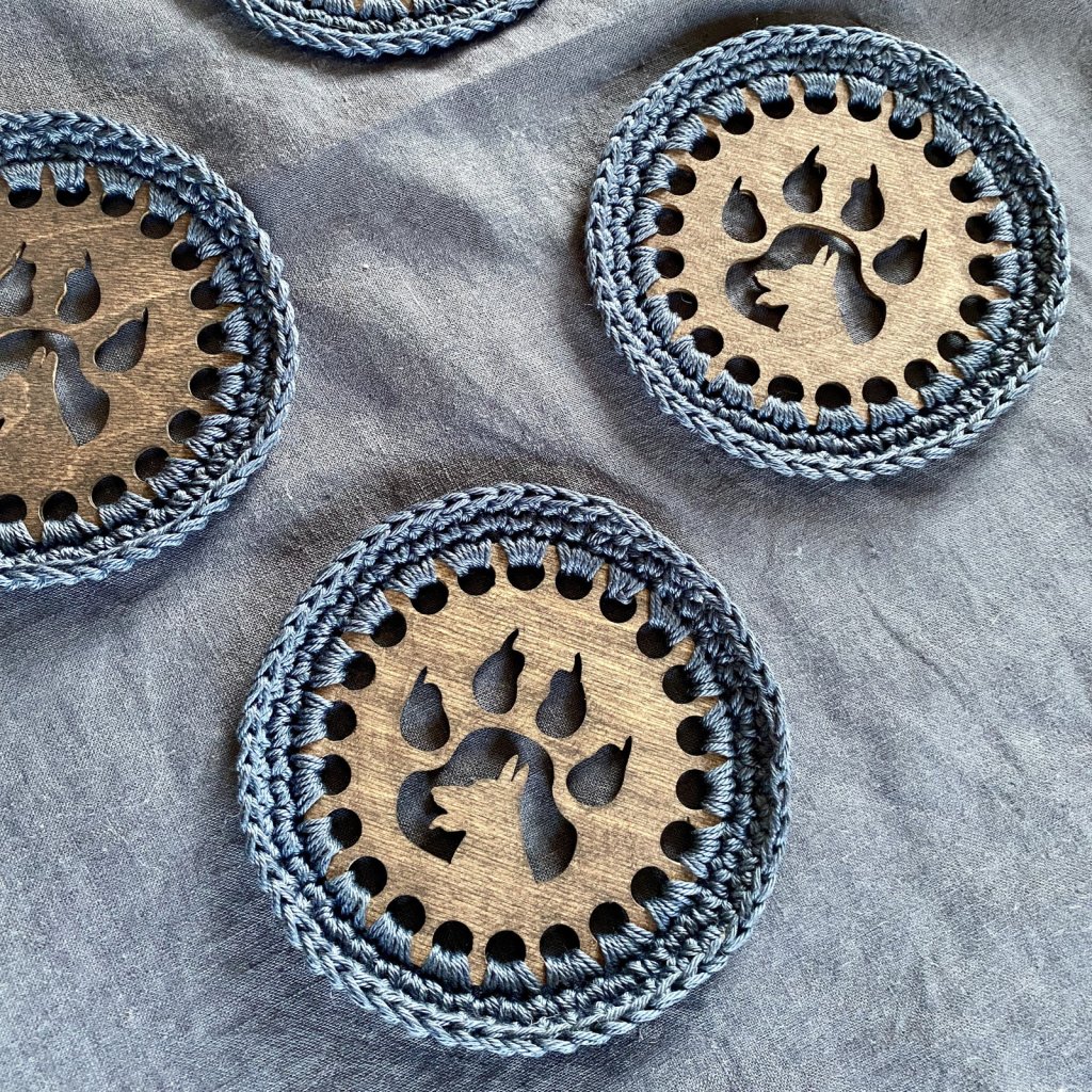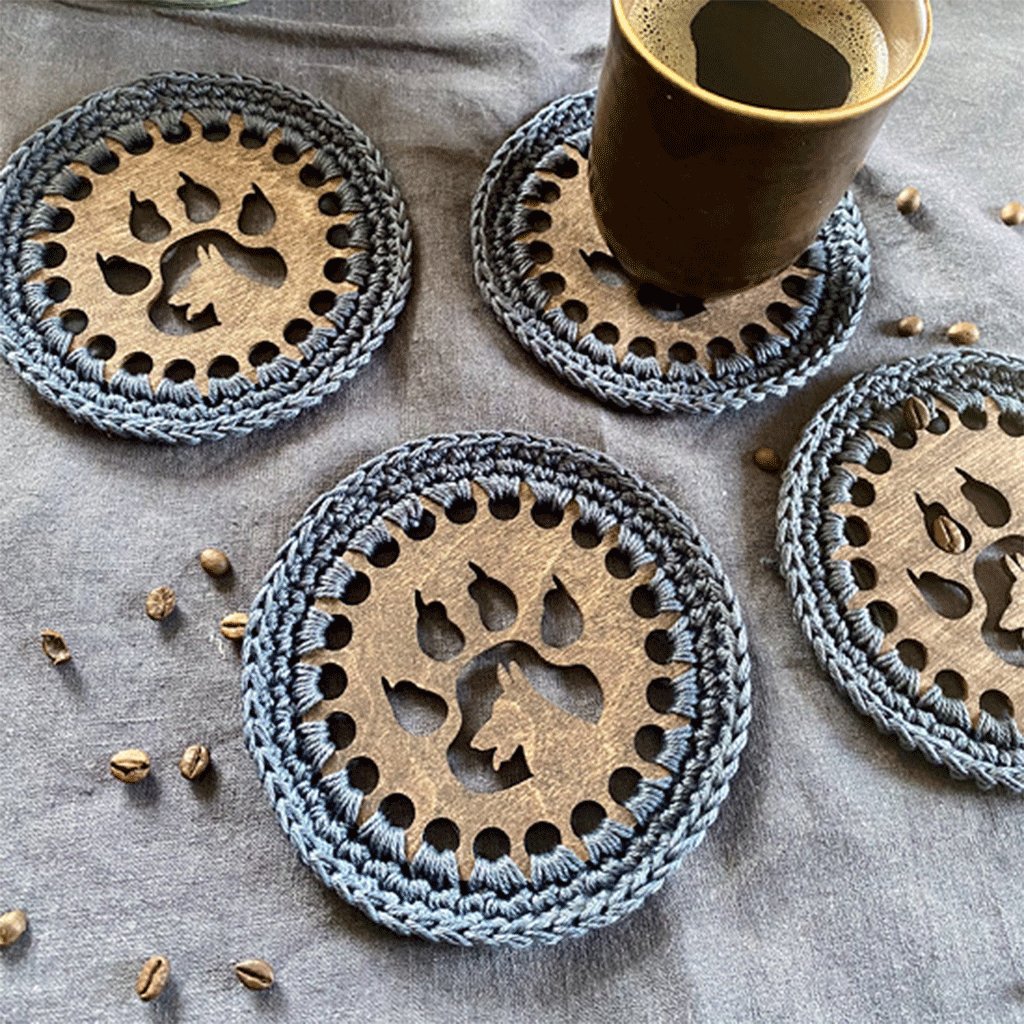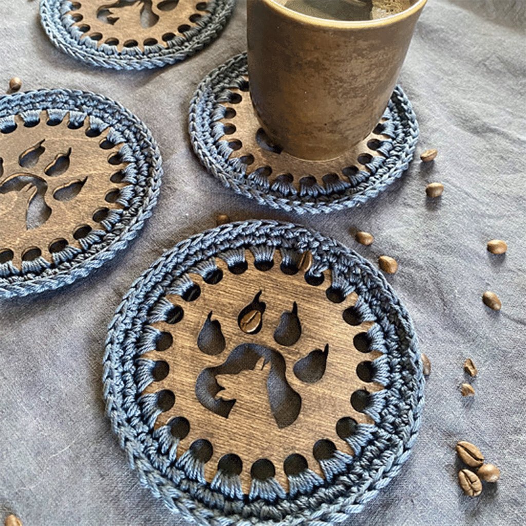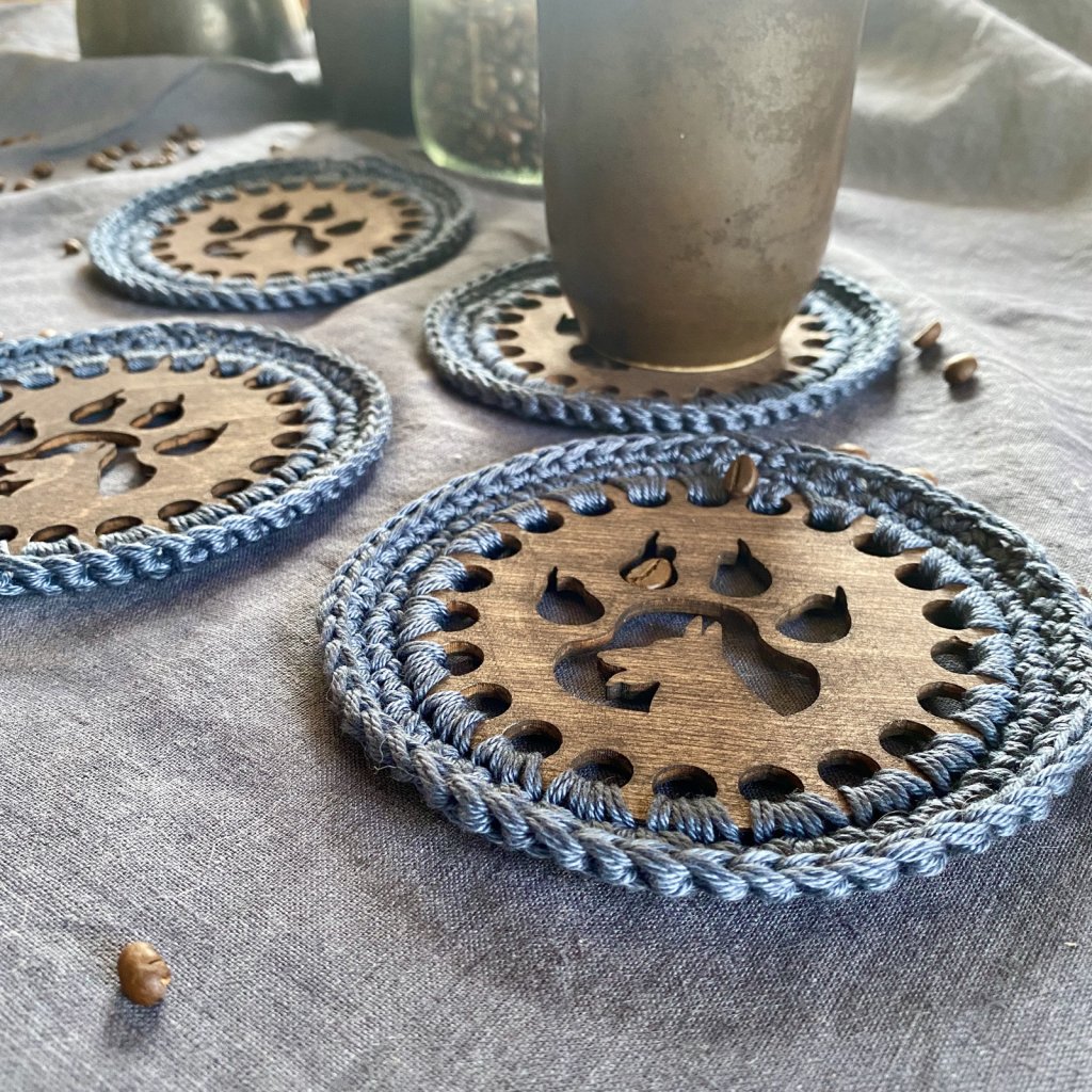 Háčkované podšálky pro čtyři – pejsek i tlapka v jednom, šedomodré