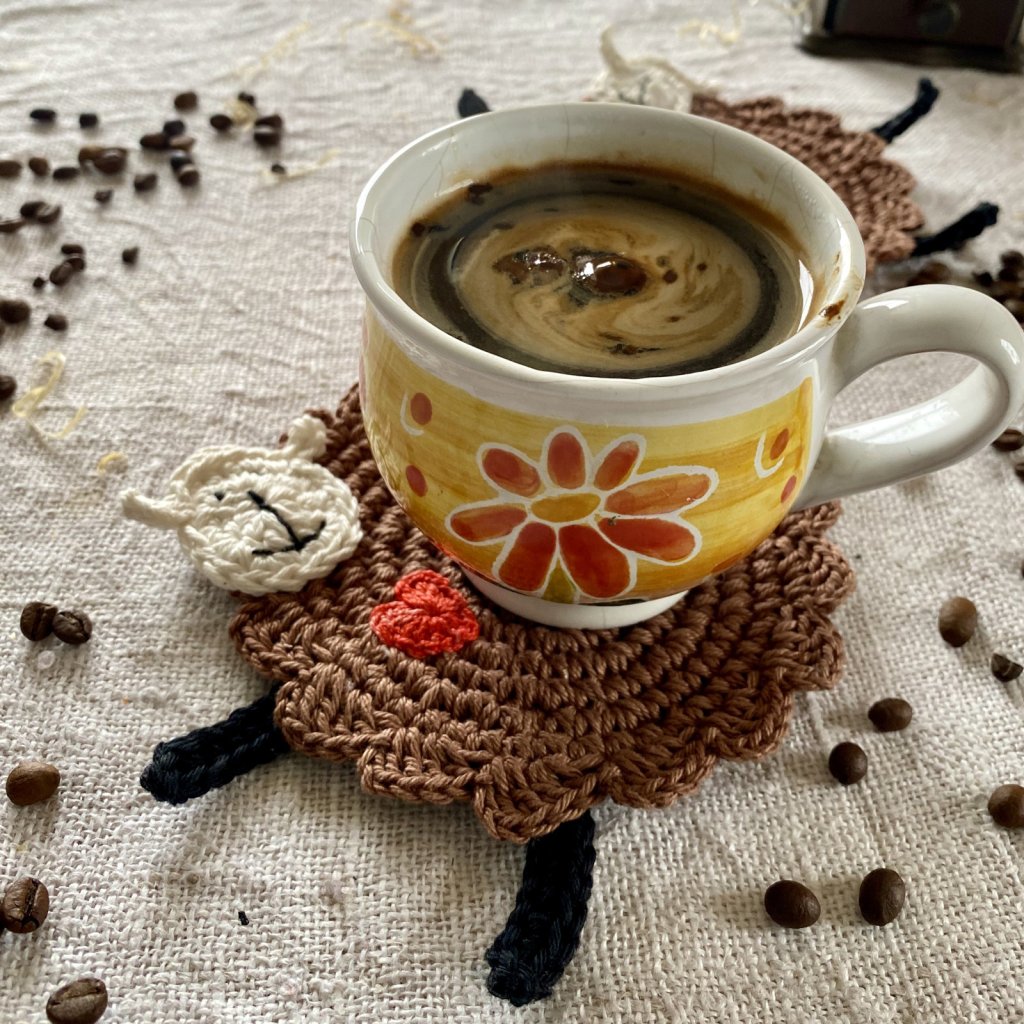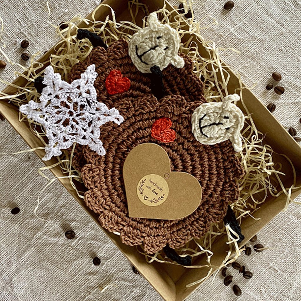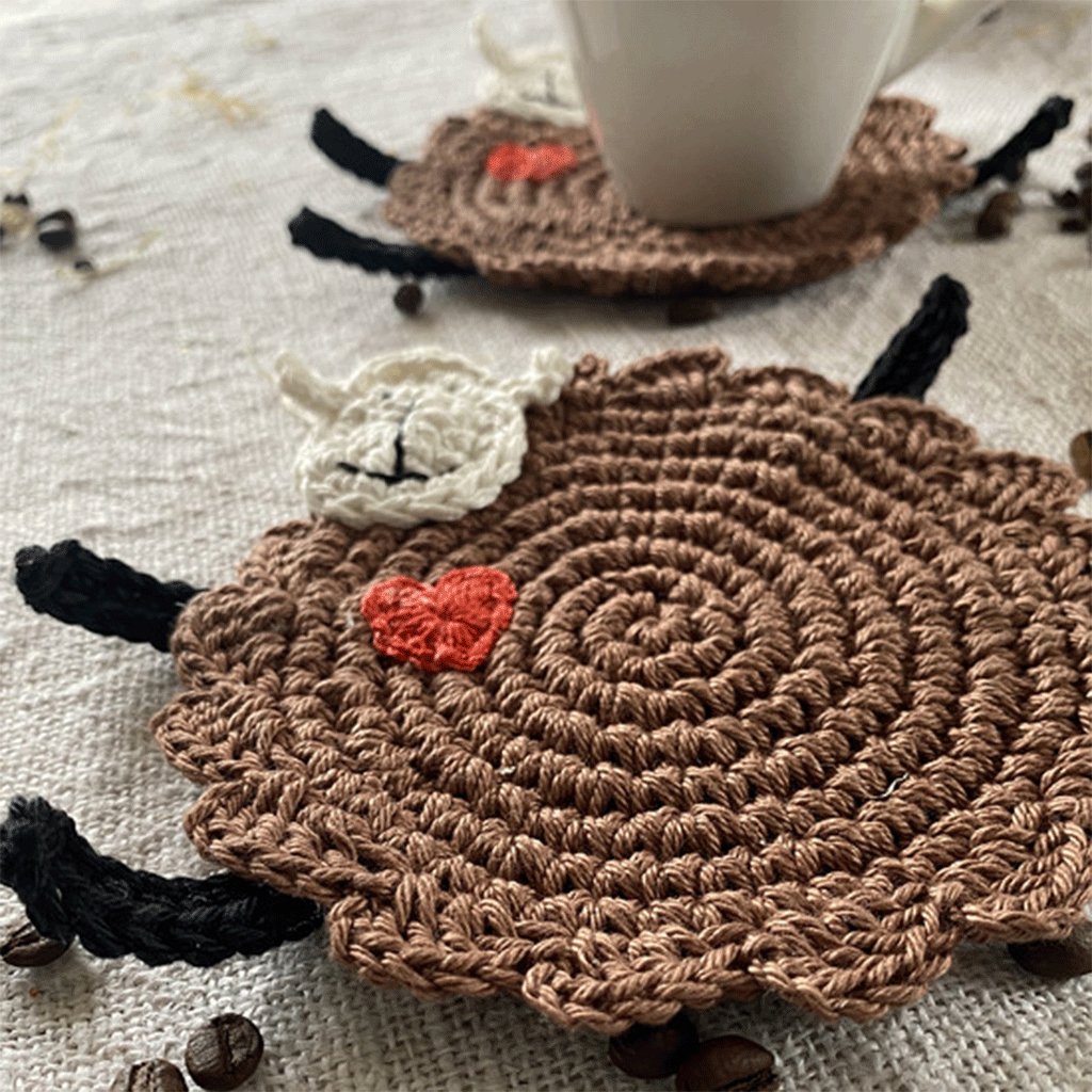 Háčkované podšálky pro dva – hnědé ovečky se srdíčkem