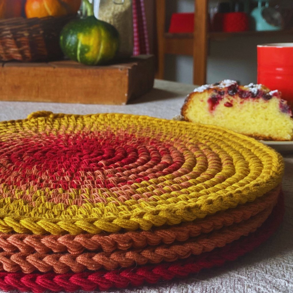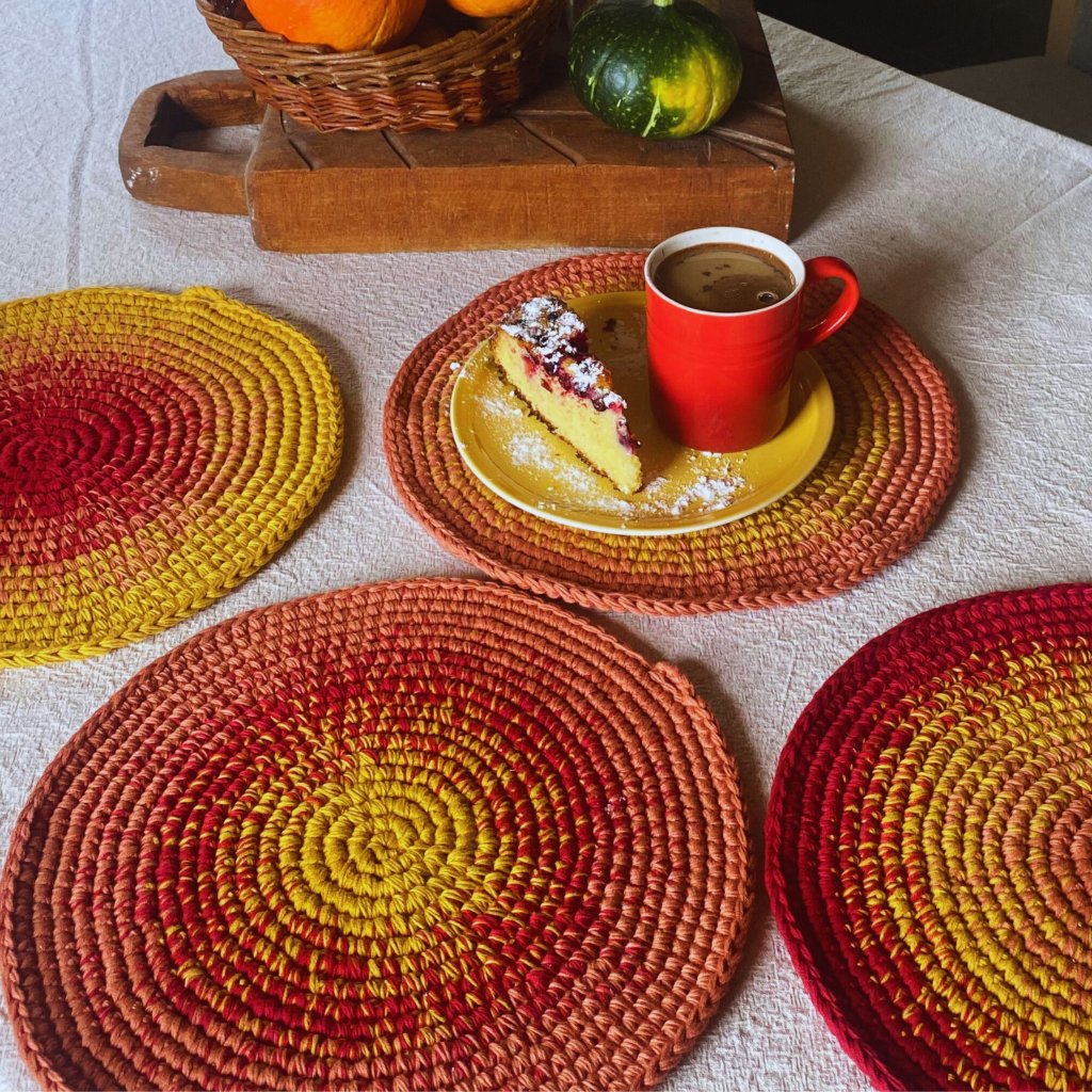 Háčkované prostírání v barvách podzimu rozzáří váš stůl. V každém kuse se střídá žlutá, vínová a hnědá – a pokaždé trochu jinak. Jedno začíná vínovou a končí žlutou, jiné naopak. Díky tomu je každé prostírání originál a dohromady tvoří krásnou sadu.