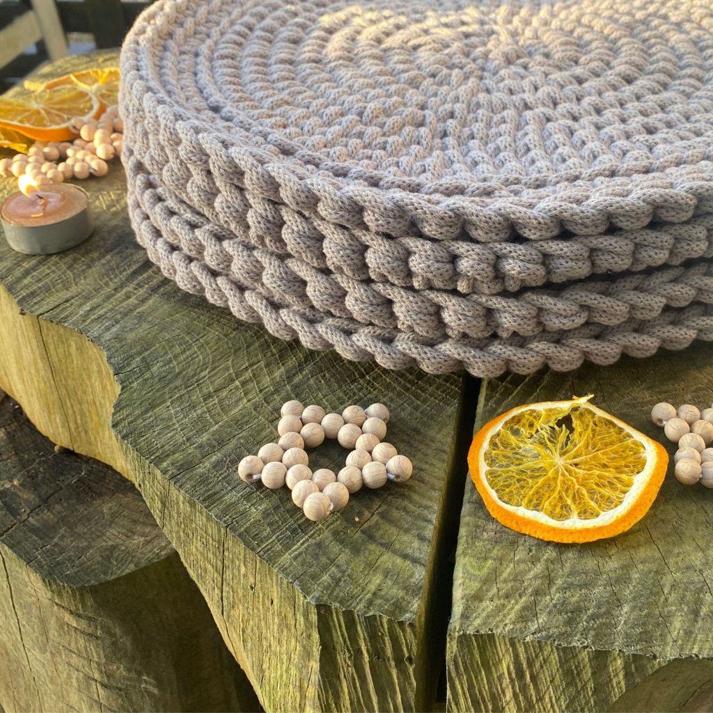 Krásné háčkované prostírání v barvě pískové (pro představu něco mezi béžovou a světle šedou) udělá parádu na každém stole. Navíc na něj můžete položit horké nádobí právě vytažené z trouby, protože prostírání je pevné a silné. Je uháčkované ze 100% recyklovaných bavlněných šňůr. To znamená, že ani uvnitř těchto šňůr není nic jiného než recyklovaná bavlna. Průměr šňůry je 5 mm, tedy opravdu velmi pevné a silné prostírání.