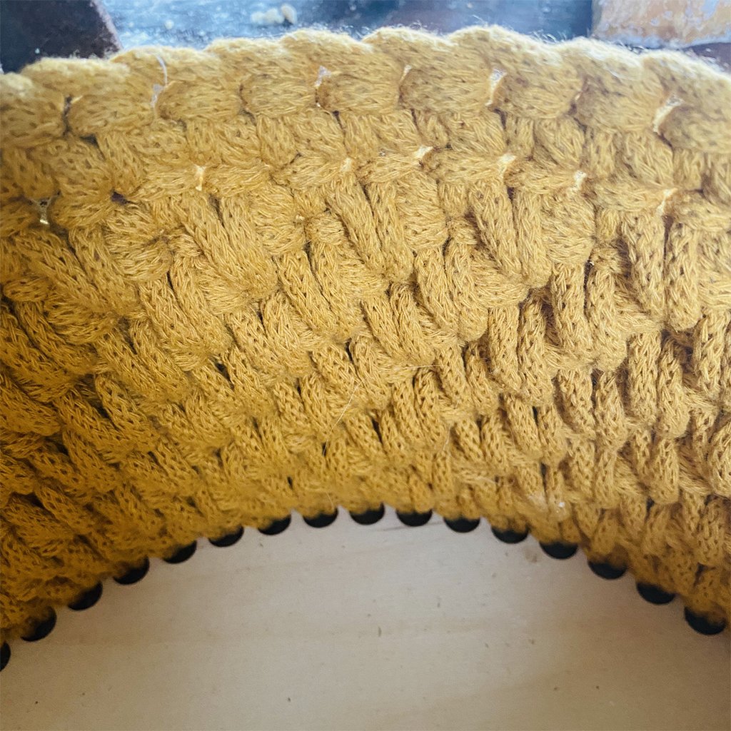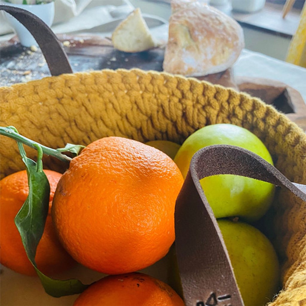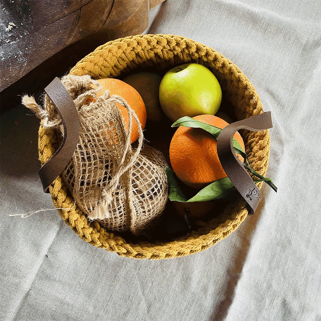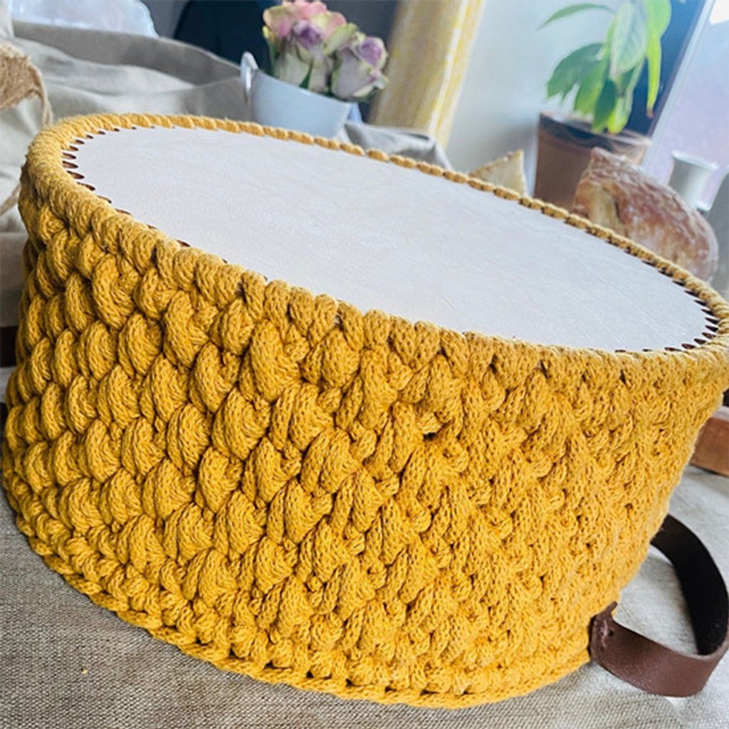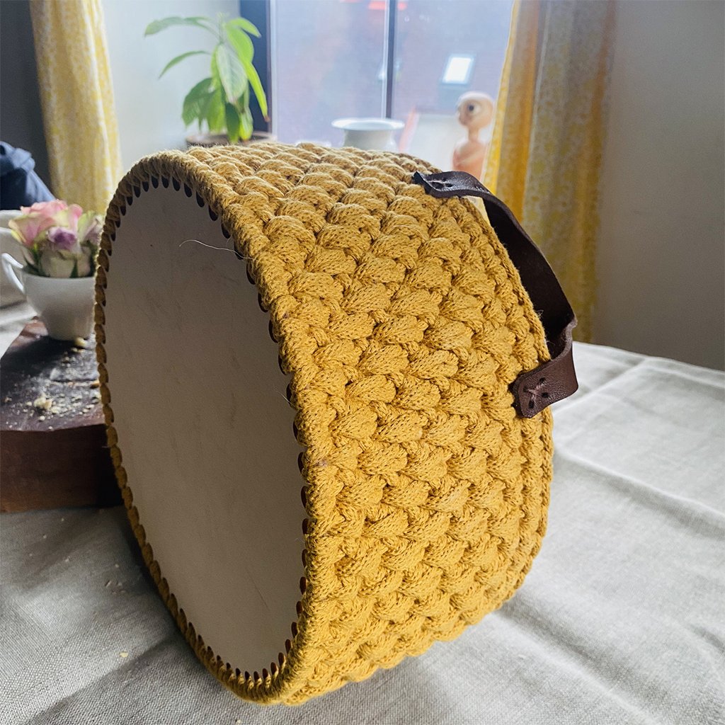 - Hořčicově žlutý koš je uháčkován z recyklovaných bavlněných šňůr s koženými oušky.