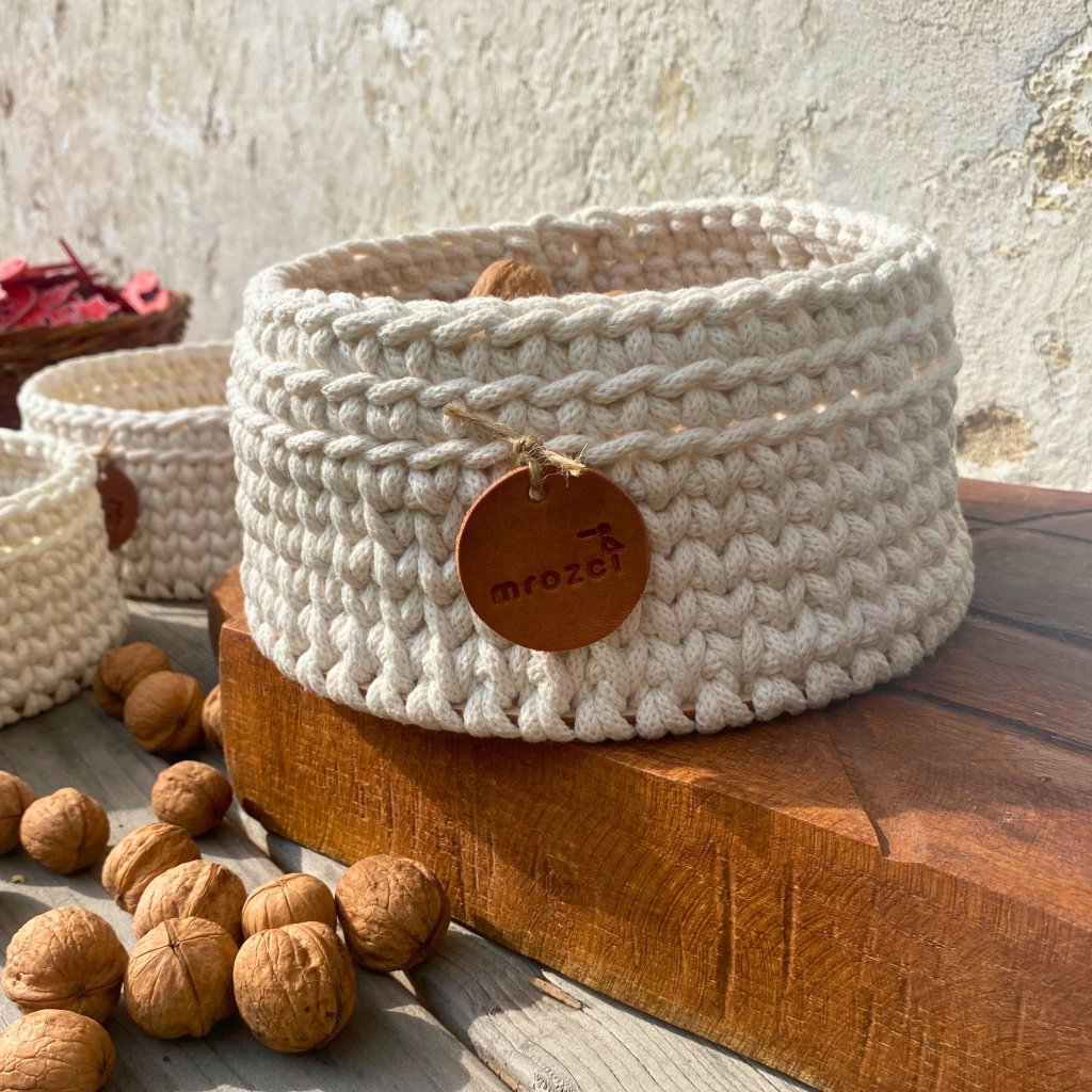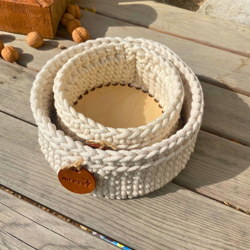 Košík je uháčkován z recyklovaných bavlněných šňůr. Dno je pevné, dřevěné. (překližka). Ke košíku je přichycena kožená cedulka s mým logem.