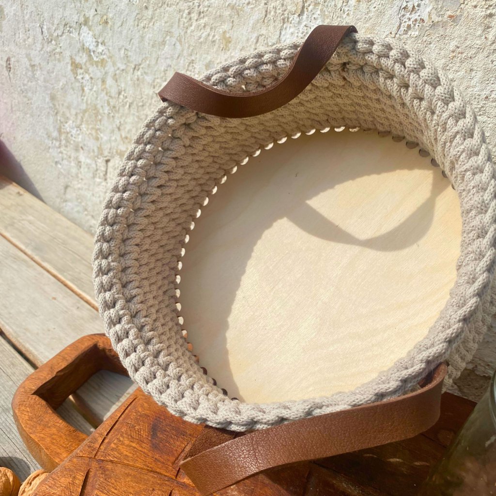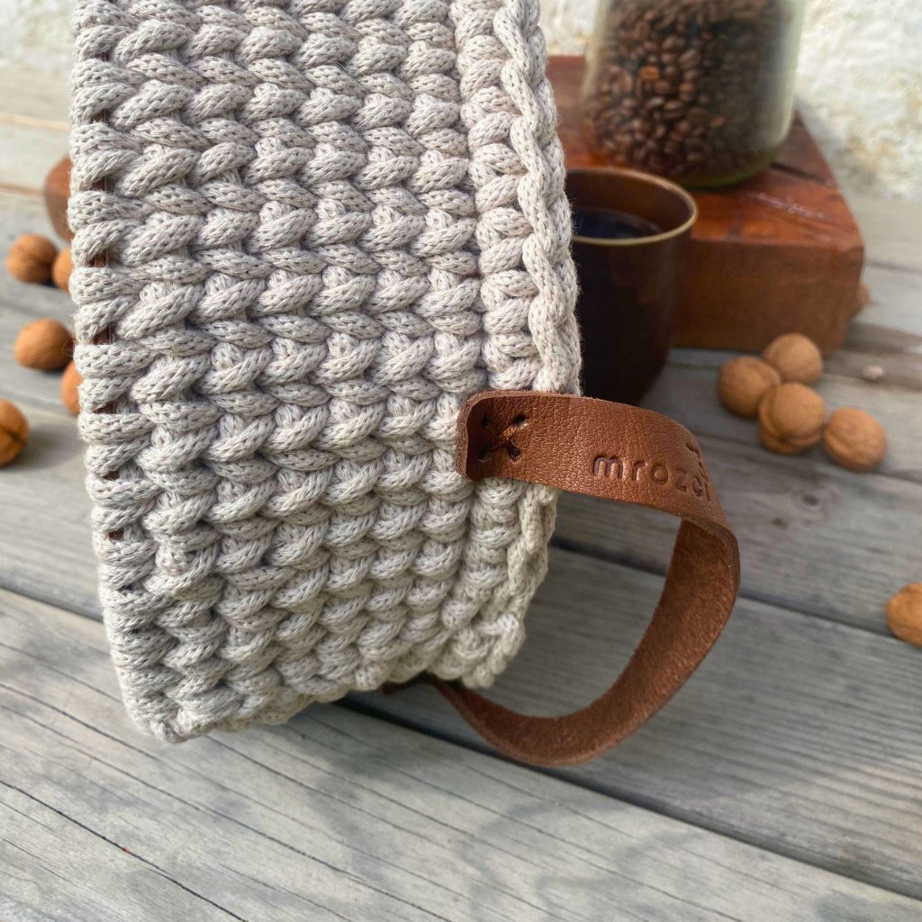 Háčkovaný koš má dno pevné, dřevěné. Má dvě kožená ucha s vyraženým logem Mrozci.
