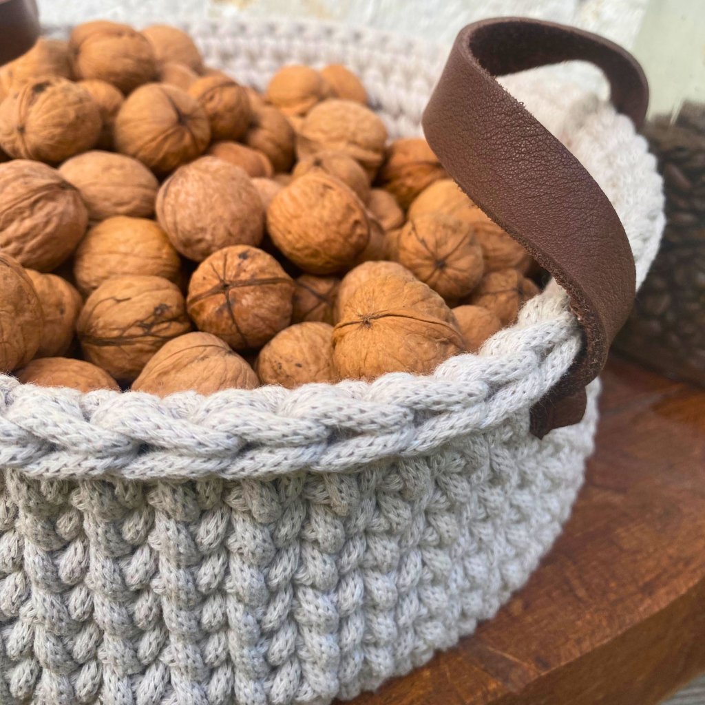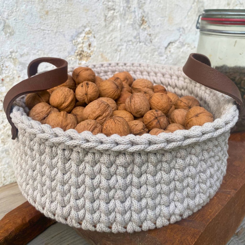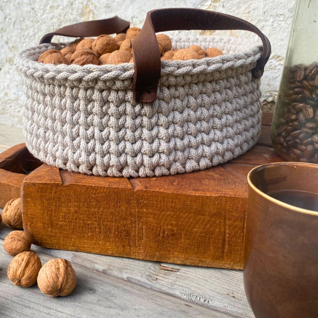 Košík je uháčkován z recyklovaných bavlněných šňůr. Dno je pevné, dřevěné. (překližka). Tento košík zdobí dvě kožená ucha.