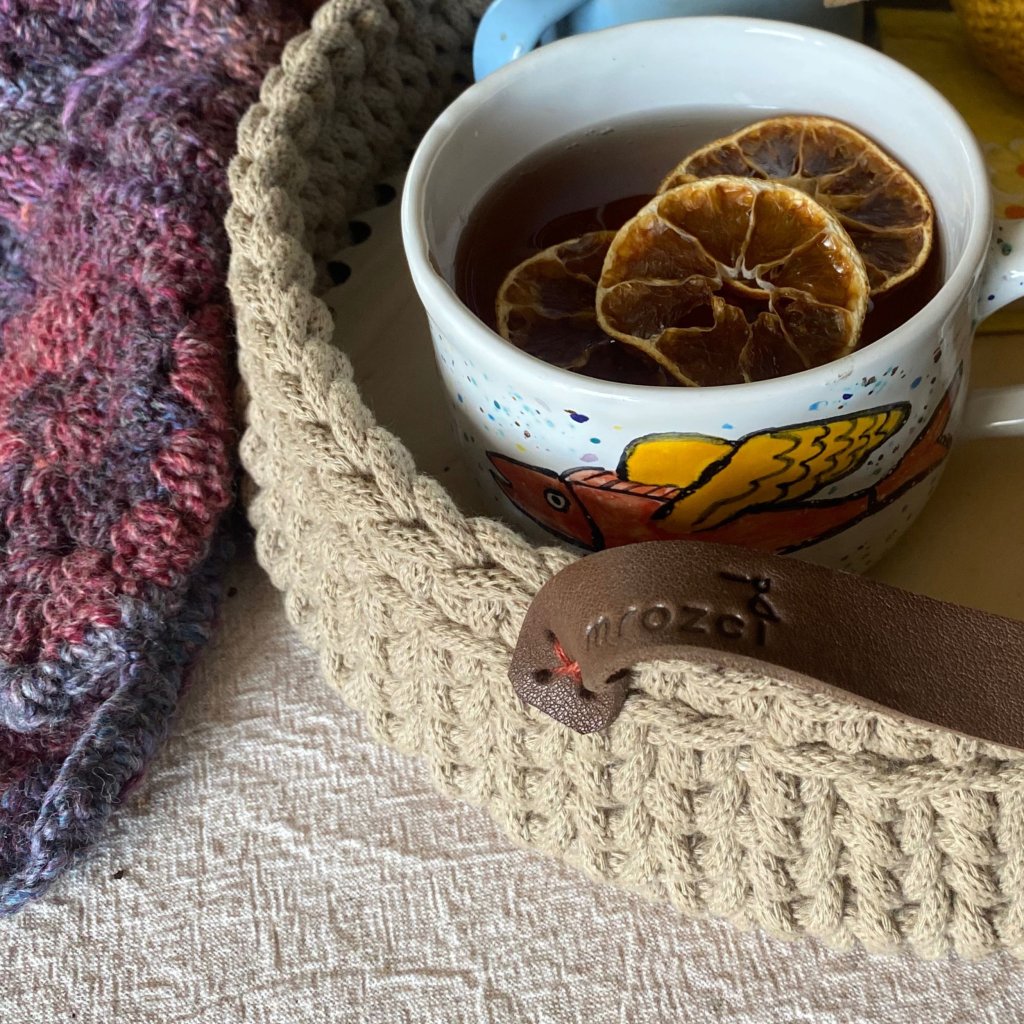 Háčkovaný košík / tác s koženými uchy