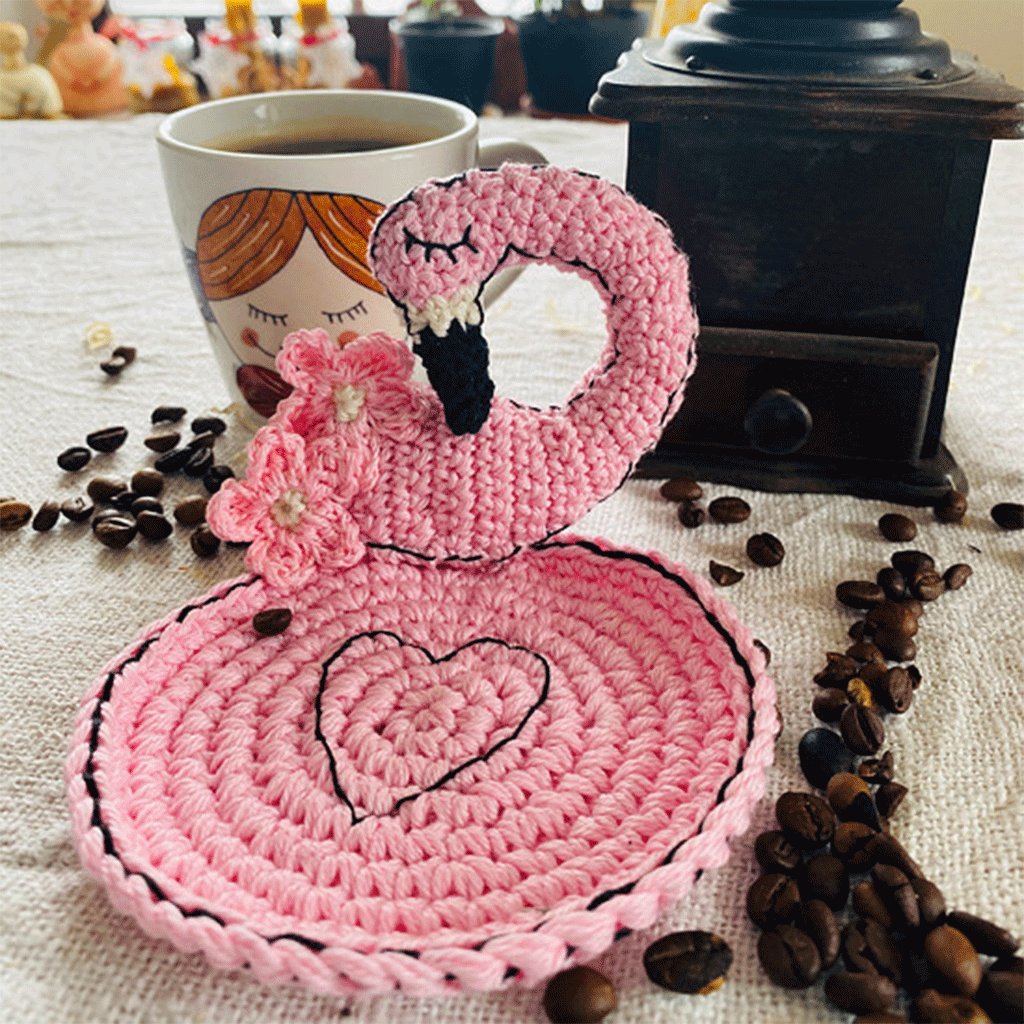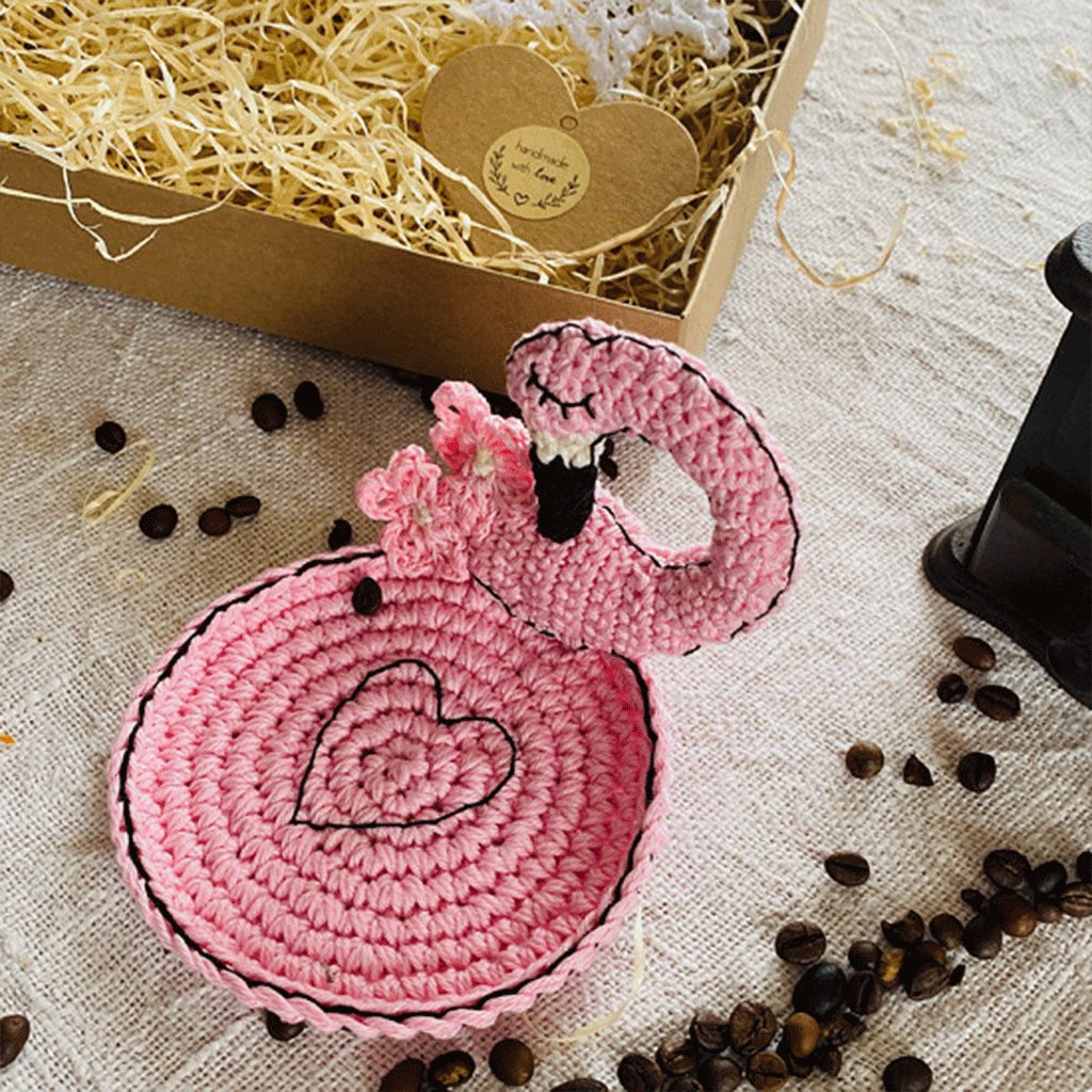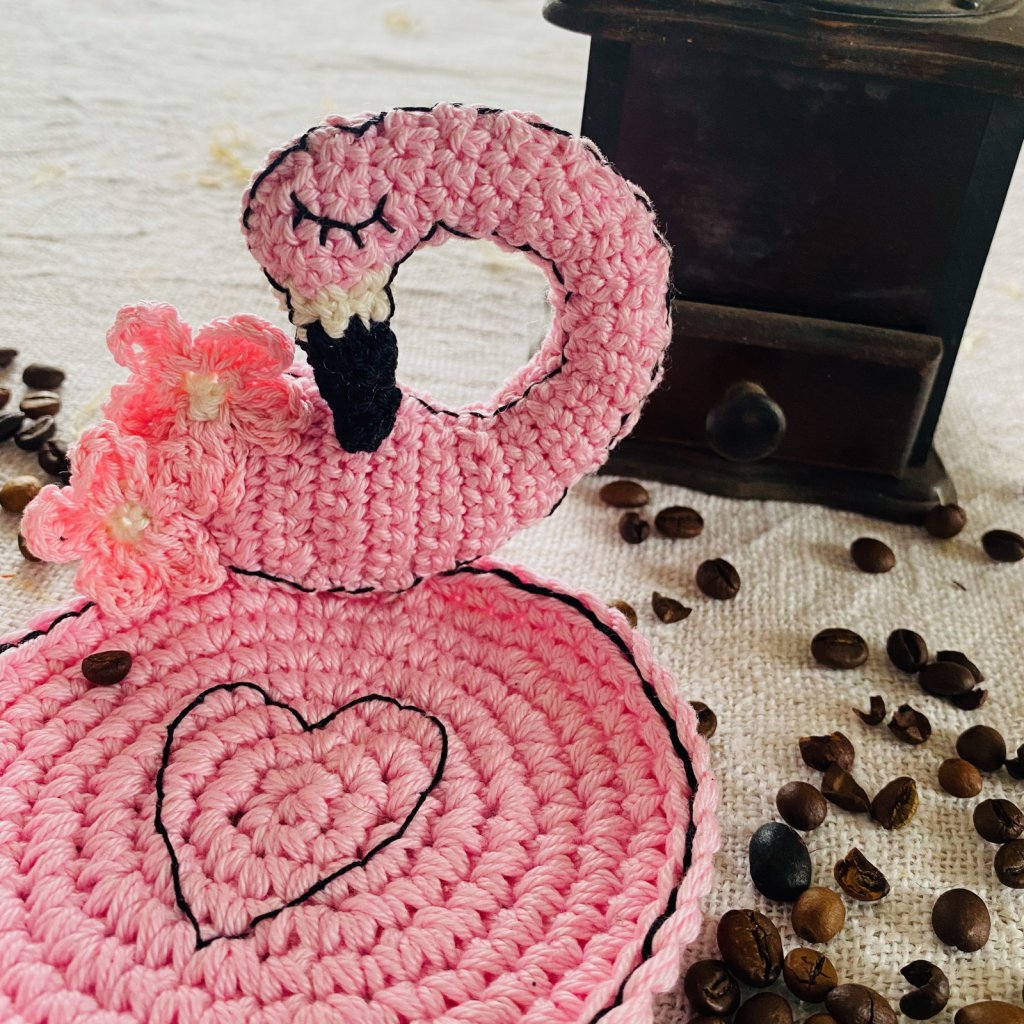 Háčkovaný podšálek – růžový plameňák třeba pro maminku
