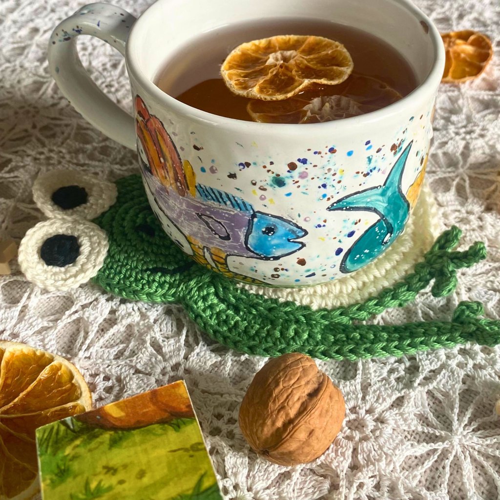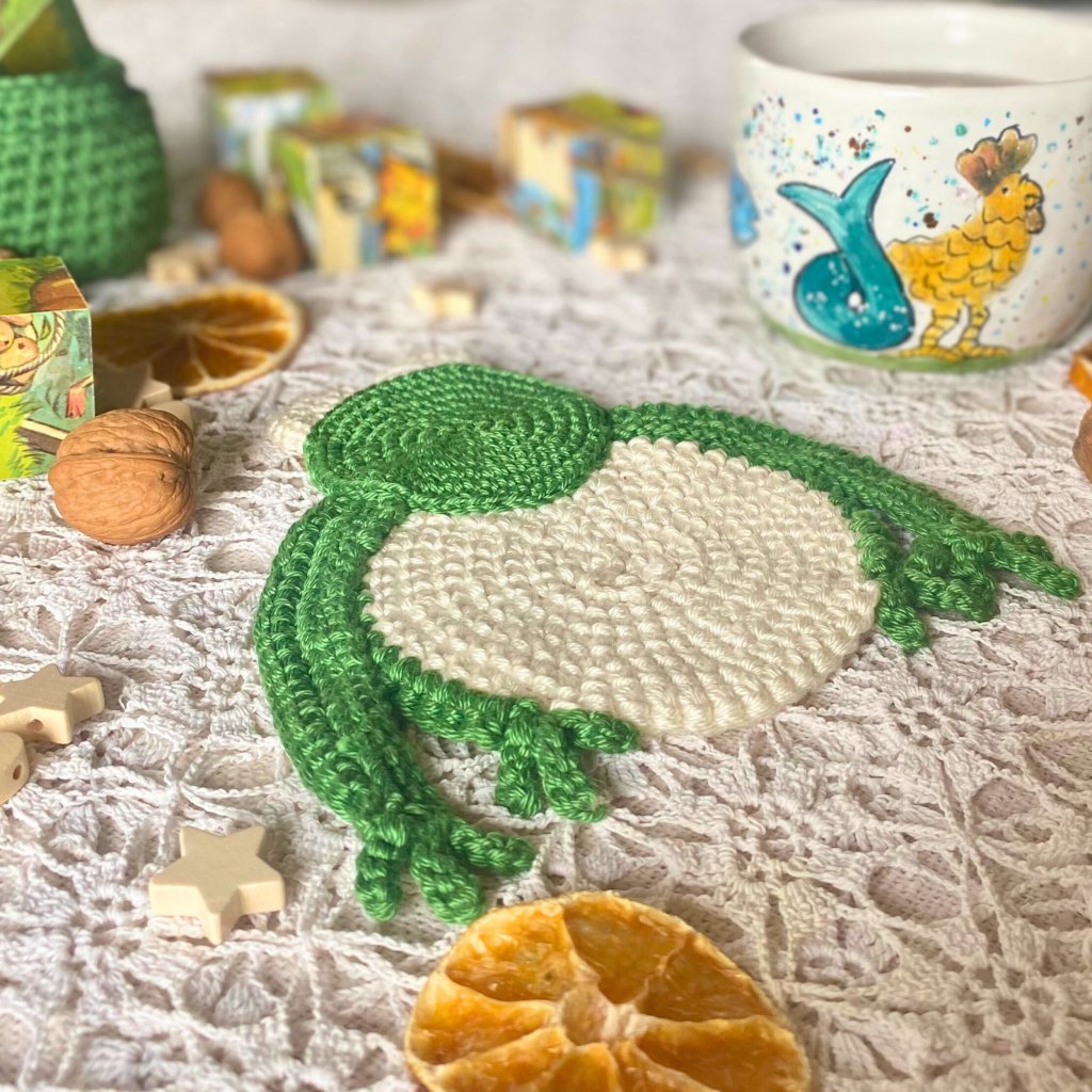 Háčkovaný podšálek Zelená žába – ruční práce z přírodní příze