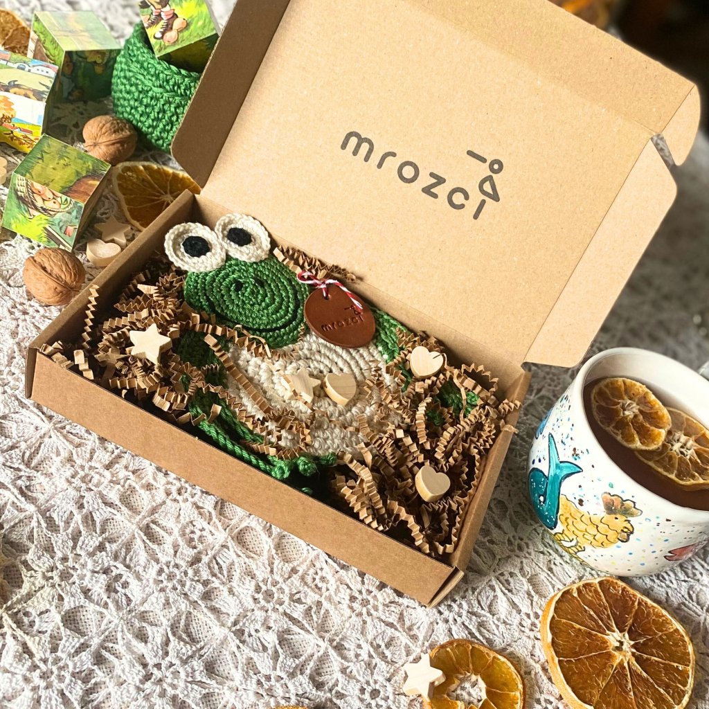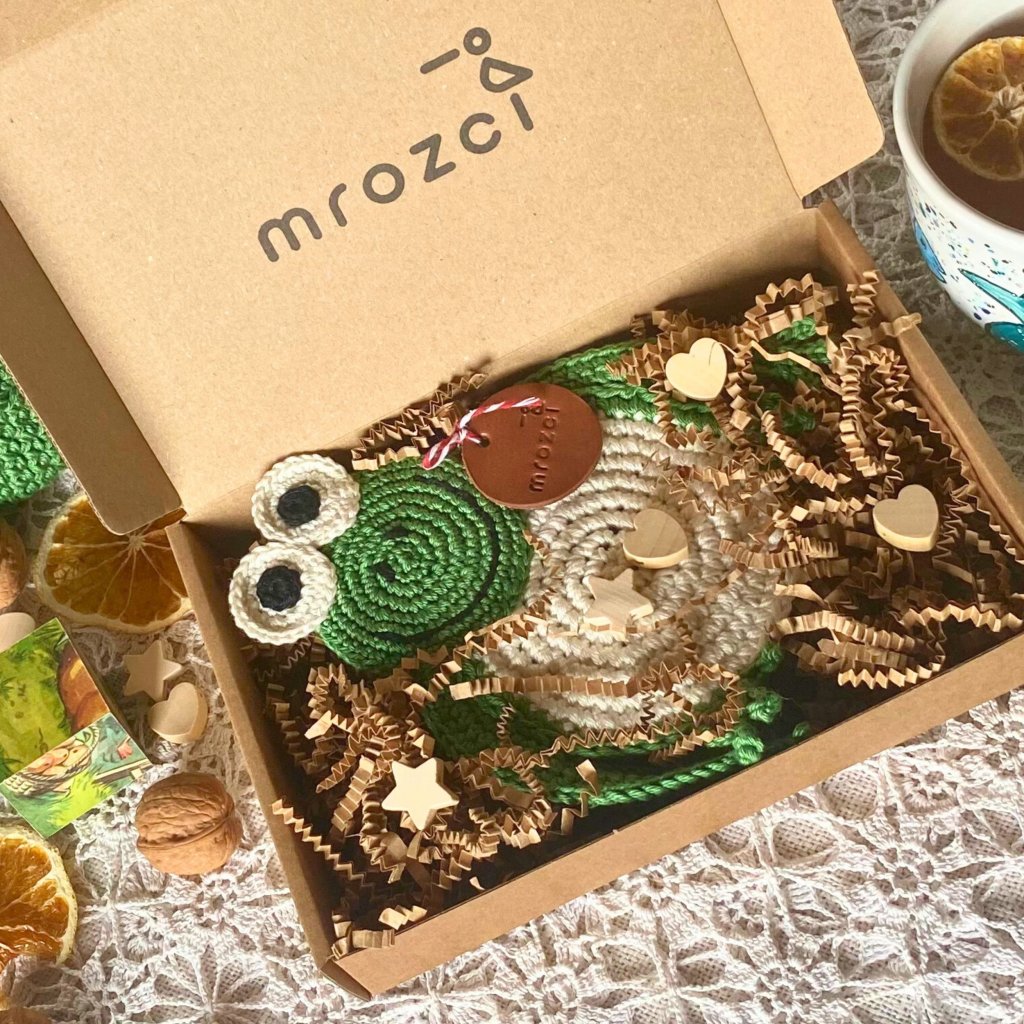 Žabka pod hrníček je krásně zabalená, vždy s dalším malým milým překvapením. Ne však vždy stejným.