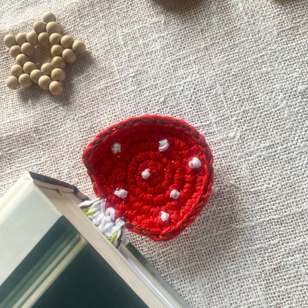 Velikost záložky: muchomůrka je velliká asi 7 cm, šňůrka je dlouhá 21 cm, červené květinky asi 5 cm. Šňůrku lze na požádání upravit.