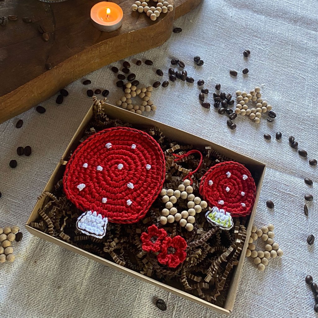 Tento balíček obsahuje jedno podkafíčko ve tvaru muchomůrky a jednu záložku do knihy, také ve tvaru muchomůrky. Je tedy skvělým malým dárkem pro milovníky či milovnice knih, kafíčka nebo čaje a dobré pohody. A protože je to dárkový balíček vánoční, tak je v něm ještě vánoční ozdoba - hvězdička z dřevěných korálků. Vše, včetně vánoční ozdoby je vyrobeno mnou :).